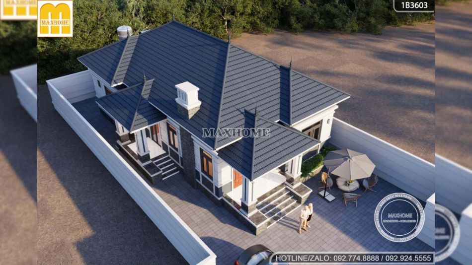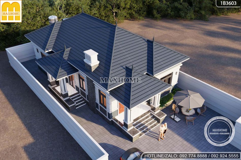 Từ góc nhìn trên cao, bạn sẽ thấy hệ mái của căn nhà cấp 4 mái Nhật được thiết kế đua ra đa hướng, giúp che nắng che mưa hiệu quả và tăng tính thẩm mỹ. Điểm nhấn nổi bật nhất nằm ở chi tiết ống khói giả trang trí, vừa tạo cảm giác ấm cúng theo phong cách nhà vườn châu Âu, vừa khiến tổng thể kiến trúc trở nên ấn tượng và thu hút hơn.
