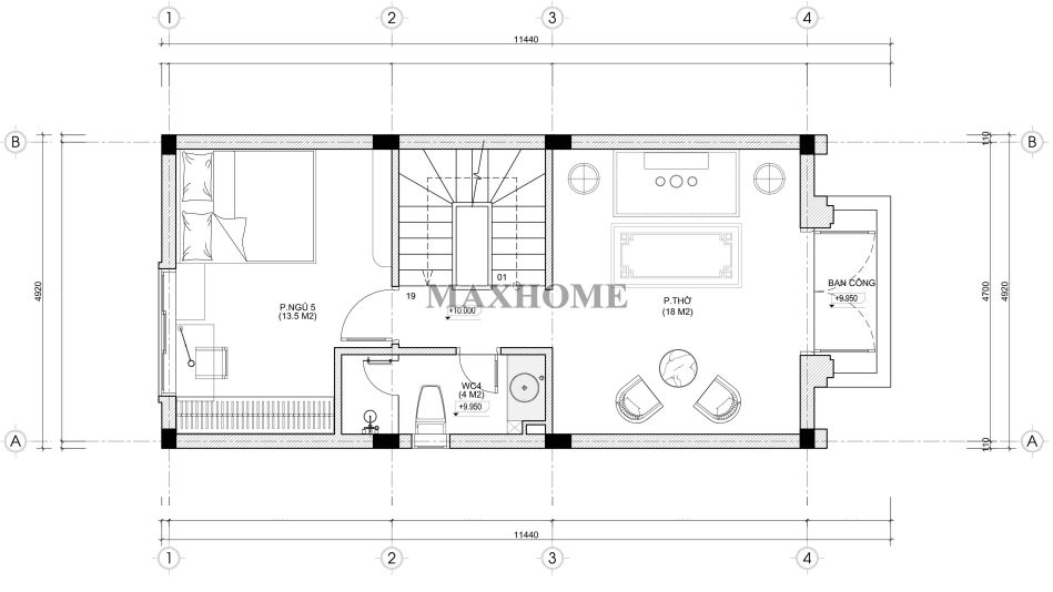 Không gian tầng 4 được bố trí linh hoạt, đáp ứng nhu cầu sinh hoạt và yếu tố tâm linh của gia đình. Phòng thờ được thiết kế trang nghiêm, đặt ở vị trí cao ráo và hướng ra ban công, giúp không gian luôn thông thoáng, đón ánh sáng tự nhiên và đảm bảo sự tĩnh tại cần thiết. Về cuối nhà là một phòng ngủ riêng tư, phù hợp cho khách hoặc thành viên trong gia đình, bên cạnh đó là nhà vệ sinh bố trí liền kề, thuận tiện cho sinh hoạt, góp phần hoàn thiện công năng sử dụng cho toàn bộ tầng.