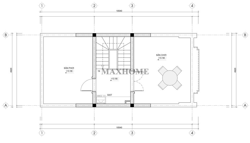 Tầng tum được bố trí linh hoạt với khu vực sân phơi và sân chơi rộng rãi, đáp ứng tốt nhu cầu sinh hoạt hằng ngày của gia đình. Không gian này được thiết kế thoáng đãng, đón nắng và gió tự nhiên hiệu quả, thuận tiện cho việc phơi đồ, trồng cây xanh hoặc bố trí góc thư giãn ngoài trời. Nhờ đó, tầng tum không chỉ phát huy tối đa công năng sử dụng mà còn góp phần mang đến sự thoải mái, cân bằng giữa không gian sống và thiên nhiên.