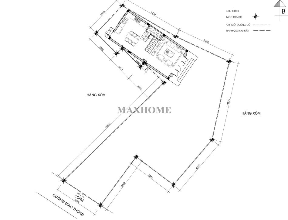 Đây là khuôn viên đất xây dựng nhà phố 4 tầng 1 tum, được thể hiện rõ ràng qua bản vẽ định vị ranh giới và các mốc tọa độ cụ thể. Khu đất có hình dáng không vuông vắn, tiếp giáp đường giao thông ở phía trước và các mặt còn lại giáp khu dân cư, đòi hỏi phương án thiết kế phải được nghiên cứu kỹ lưỡng để tận dụng tối đa diện tích sử dụng. Trên hiện trạng khu đất, kiến trúc sư đã tính toán hợp lý hướng tiếp cận, khoảng lùi và vị trí đặt công trình, nhằm đảm bảo giao thông thuận tiện, thông thoáng, đủ ánh sáng – gió tự nhiên, đồng thời đáp ứng đầy đủ công năng cho mẫu nhà phố cao tầng hiện đại giữa khu đô thị.