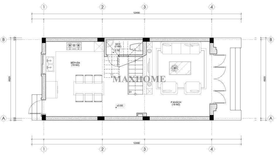 Từ sảnh chính bước vào là không gian phòng khách được bố trí gọn gàng, thông thoáng, tạo cảm giác thân thiện và thuận tiện cho việc tiếp đón khách. Tiến sâu vào bên trong, khu vực cầu thang được sắp xếp hợp lý, đóng vai trò kết nối các tầng và phân tách khéo léo các không gian chức năng. Phòng bếp và phòng ăn được đặt về cuối nhà, đảm bảo sự riêng tư, hạn chế mùi và tiếng ồn, đồng thời thuận tiện cho sinh hoạt hằng ngày. Nhà vệ sinh chung được bố trí khoa học ngay dưới gầm cầu thang, tận dụng tối đa diện tích sử dụng mà vẫn đảm bảo sự kín đáo, gọn gàng và tiện lợi cho cả gia đình.