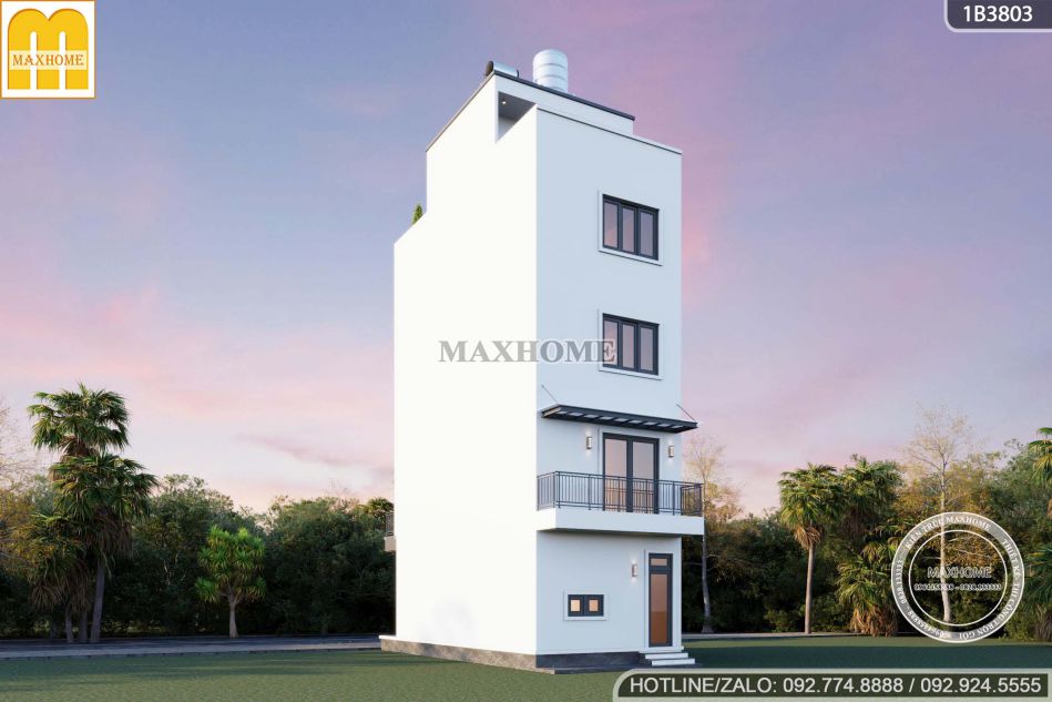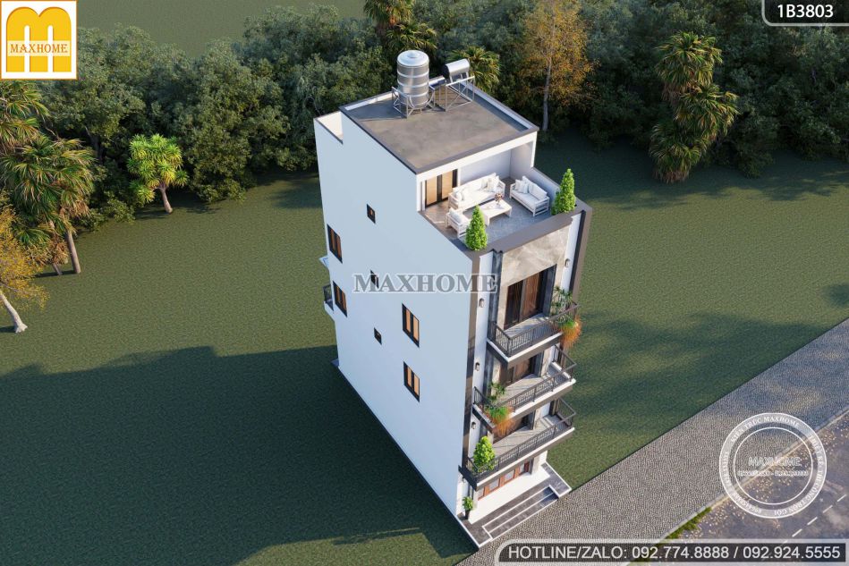 Nhìn từ góc nhìn trên cao, nhà phố 4 tầng 1 tum gây ấn tượng với hệ ban công được thiết kế bằng sắt sơn tĩnh điện chắc chắn, có khả năng chống gỉ sét và chịu được tác động của thời tiết, đảm bảo độ bền lâu dài theo thời gian. Thiết kế ban công không chỉ đáp ứng yêu cầu an toàn khi sử dụng mà còn góp phần tạo điểm nhấn thẩm mỹ cho mặt đứng công trình, đồng thời mang đến không gian mở thoáng đãng, giúp ngôi nhà thêm phần thông thoáng và hài hòa với cảnh quan xung quanh.