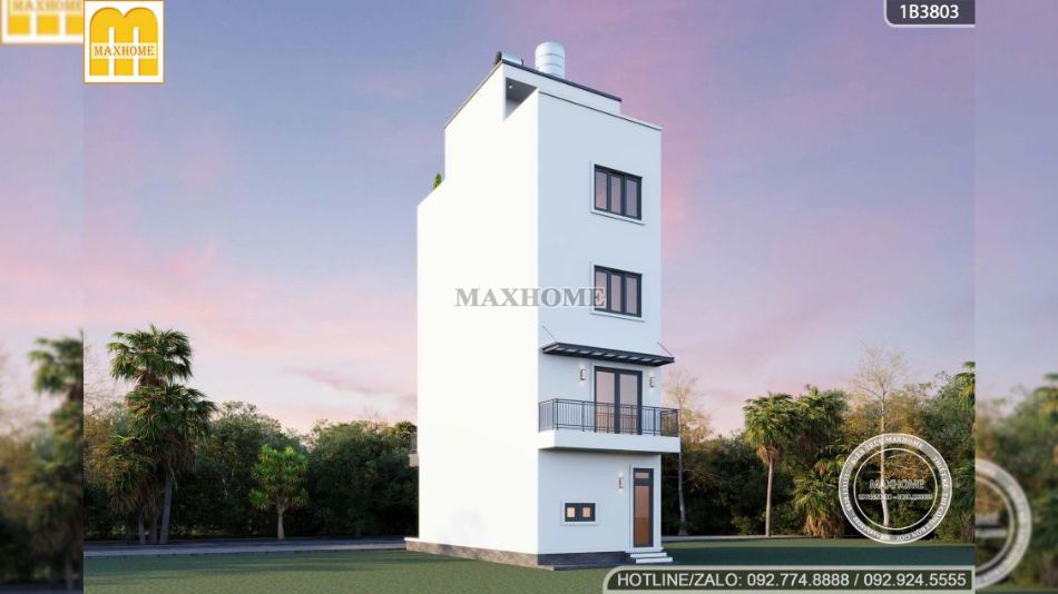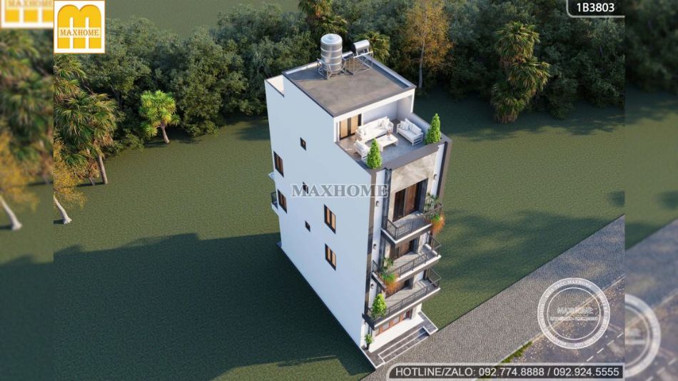 Nhìn từ góc nhìn trên cao, nhà phố 4 tầng 1 tum gây ấn tượng với hệ ban công được thiết kế bằng sắt sơn tĩnh điện chắc chắn, có khả năng chống gỉ sét và chịu được tác động của thời tiết, đảm bảo độ bền lâu dài theo thời gian. Thiết kế ban công không chỉ đáp ứng yêu cầu an toàn khi sử dụng mà còn góp phần tạo điểm nhấn thẩm mỹ cho mặt đứng công trình, đồng thời mang đến không gian mở thoáng đãng, giúp ngôi nhà thêm phần thông thoáng và hài hòa với cảnh quan xung quanh.