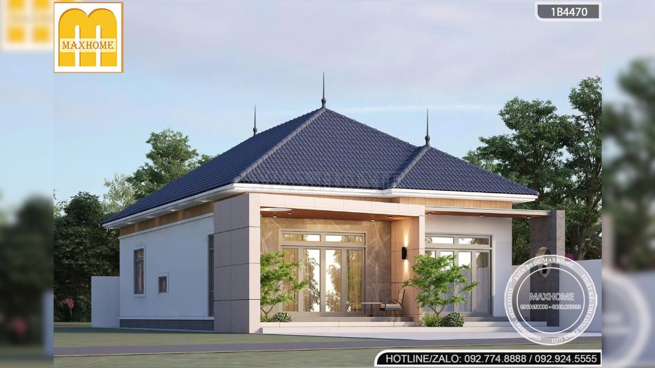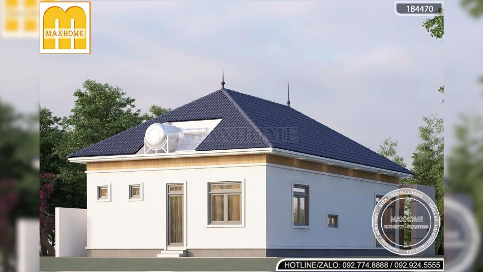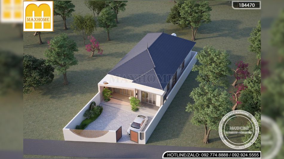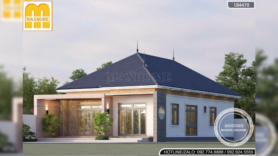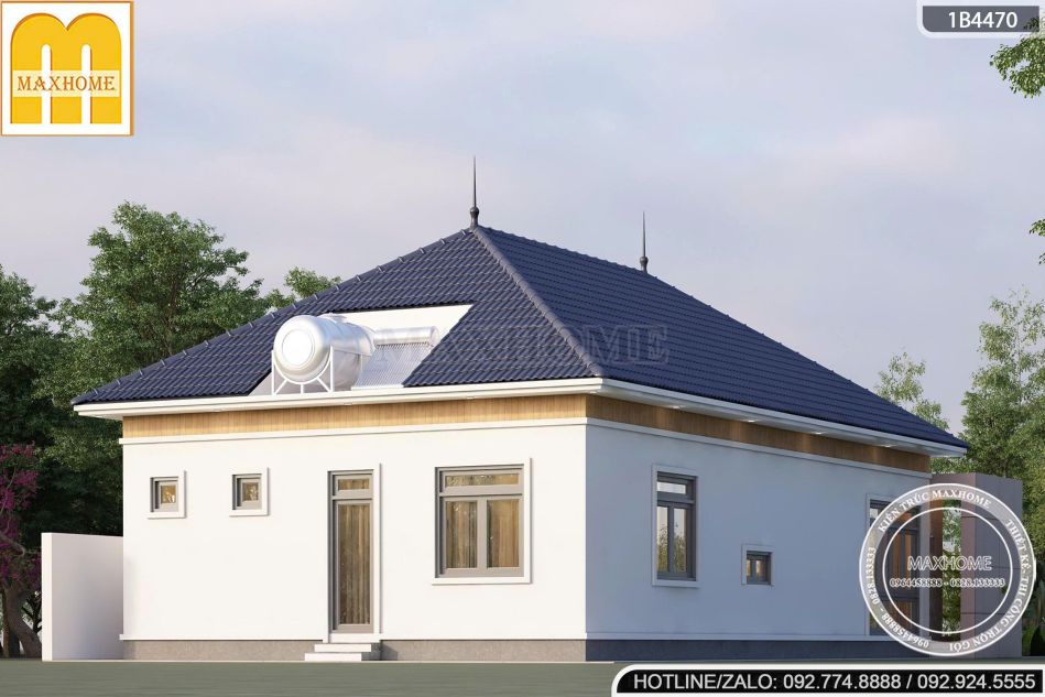 Điểm nổi bật không thể bỏ qua của mẫu nhà vườn 1 tầng này chính là hệ mái Nhật đặc trưng. Mái có độ dốc vừa phải, mở rộng đều về các hướng, tạo cảm giác cân đối và mềm mại cho tổng thể ngôi nhà. So với mái Thái, mái Nhật mang dáng vẻ nhẹ nhàng hơn, phù hợp với những gia chủ yêu thích sự tinh tế, hiện đại nhưng vẫn giữ được nét truyền thống Á Đông.