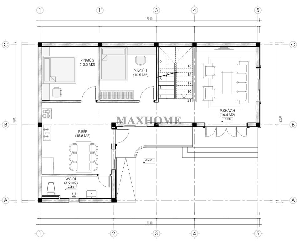Ngôi nhà phố 2 tầng được thiết kế theo dạng chữ L nhằm tối ưu hóa diện tích trên khuôn viên đất không quá rộng. Gia chủ mong muốn không gian sống phải thật thoáng đãng, đồng thời vẫn có một khoảng sân nhỏ để đón gió và lấy sáng. Hiểu được nhu cầu đó, đội ngũ KTS Maxhome đã đưa ra phương án bố trí hợp lý, tạo nên một mẫu nhà vừa đảm bảo thẩm mỹ, vừa đáp ứng đầy đủ công năng sử dụng cho gia đình.