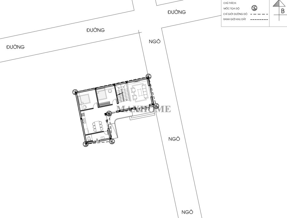 Dựa trên bản vẽ mặt bằng định vị, công trình được xây dựng trong khu vực ngõ với kích thước tổng thể 12,9 x 9,2m. Diện tích này cho phép bố trí không gian sống hợp lý, đáp ứng nhu cầu sinh hoạt của gia đình. Tổng diện tích sử dụng của ngôi nhà vào khoảng 210m², bao gồm đầy đủ các không gian chức năng được phân chia khoa học, tiện nghi và tối ưu cho sinh hoạt hằng ngày.