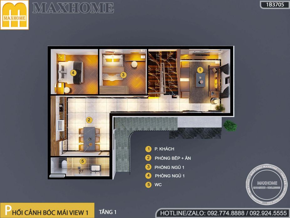 Từ sảnh chính bước vào là không gian phòng khách rộng 16,4m², được thiết kế thoáng đãng và thuận tiện cho việc tiếp khách. Kế bên là khu vực bếp ăn được bố trí gần sảnh phụ, giúp việc di chuyển và thông gió trở nên dễ dàng hơn. Nhà vệ sinh chung được đặt cạnh khu bếp, đảm bảo sự tiện lợi cho cả gia đình. Ngoài ra, tầng này còn có hai phòng ngủ nằm liền kề nhau, tạo sự gắn kết và thuận tiện trong sinh hoạt hằng ngày.