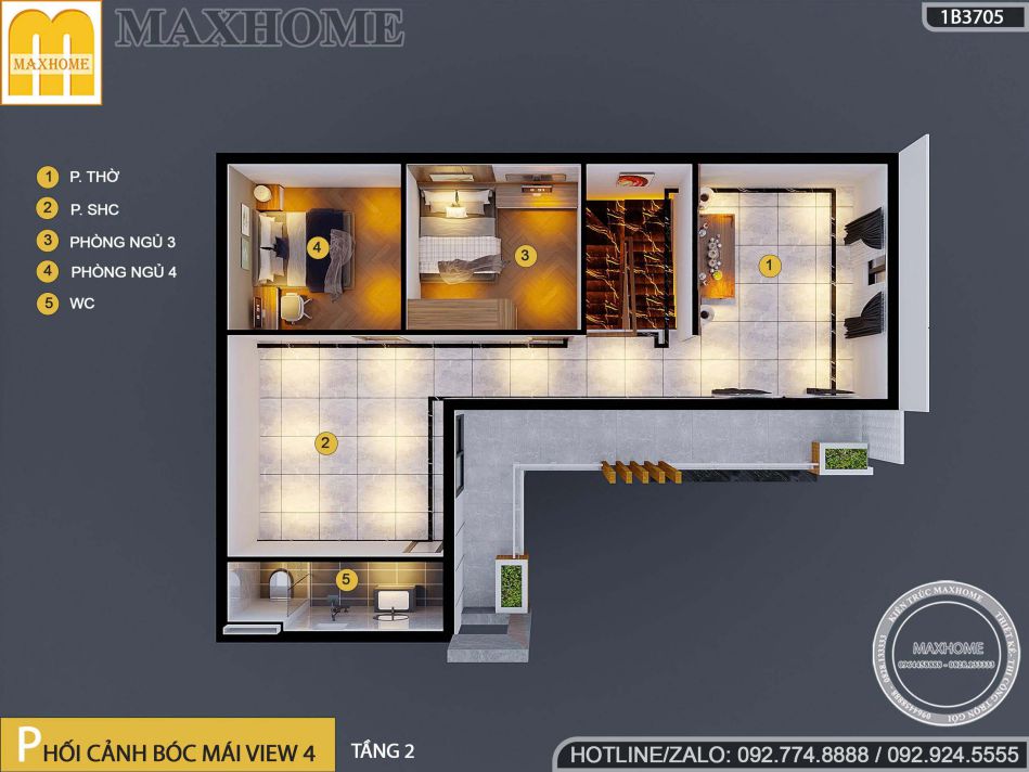 Tầng 2 được bố trí phòng thờ trang nghiêm, có cửa sổ thông thoáng giúp hạn chế ám mùi nhang khói và tạo sự lưu thông không khí. Bên cạnh đó, tầng này gồm hai phòng ngủ được sắp xếp liền kề, mang lại sự thuận tiện trong sinh hoạt. Ngoài ra còn có một phòng sinh hoạt chung làm nơi kết nối các thành viên gia đình, cùng với một nhà vệ sinh chung phục vụ tiện nghi cho cả tầng.
