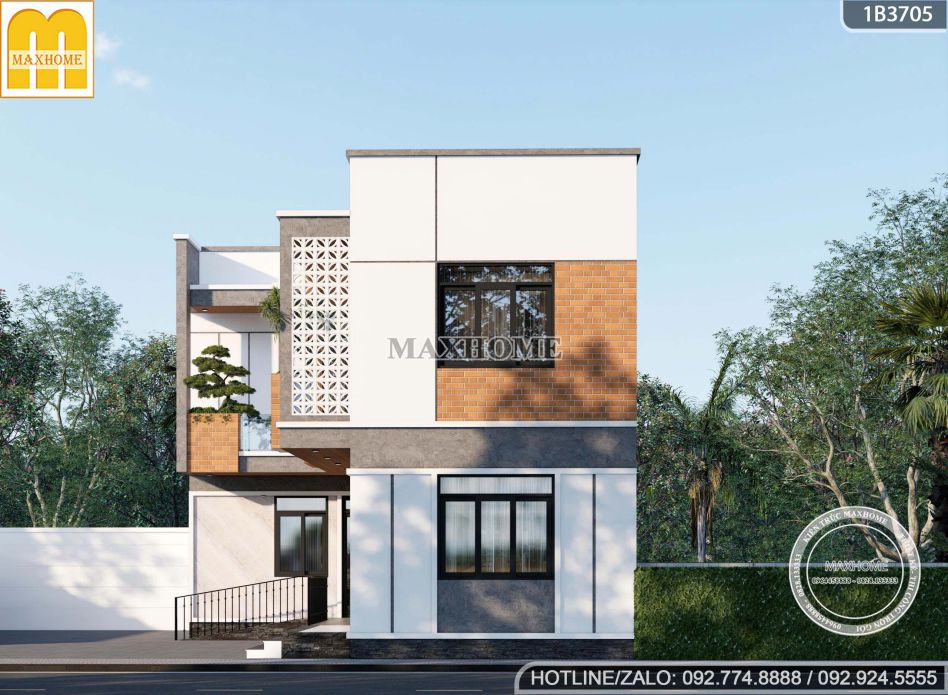 Đối với mẫu nhà phố 2 tầng chữ L, để hạn chế tình trạng hắt mưa vào khu vực ban công, KTS Maxhome đã khéo léo bố trí mảng tường gạch bông gió. Chi tiết này không chỉ giúp chắn mưa, giảm bức xạ nhiệt mà còn đóng vai trò như một yếu tố trang trí thẩm mỹ, tạo điểm nhấn độc đáo cho mặt tiền công trình. Nhờ vậy, ngôi nhà vừa đảm bảo công năng sử dụng, vừa giữ được nét đẹp hiện đại và thông thoáng.