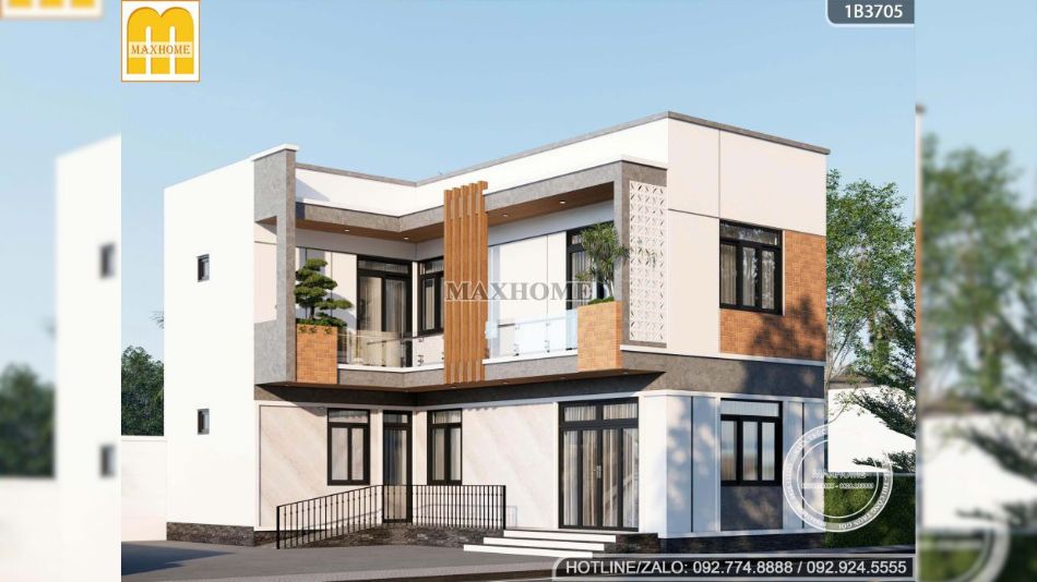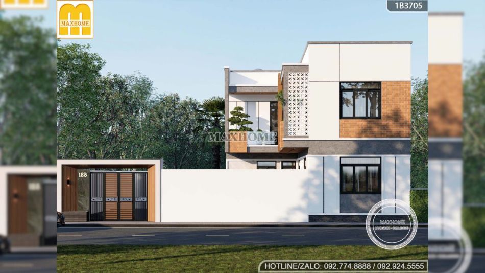 Nhà 2 tầng chữ L sử dụng gam màu trắng chủ đạo, mang đến vẻ đẹp tinh tế và hiện đại. Đi cùng đó là tông nâu gỗ ấm áp từ các mảng gạch ốp tại một số vị trí mặt tiền, giúp công trình trở nên nổi bật và hài hòa hơn. Bên cạnh đó, hệ lam trang trí được bố trí khéo léo, vừa tạo điểm nhấn ấn tượng, vừa hỗ trợ che nắng và tăng tính riêng tư cho không gian sống.