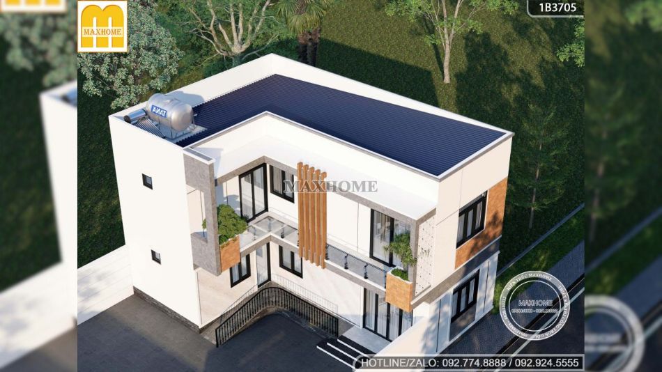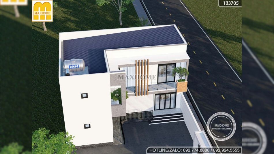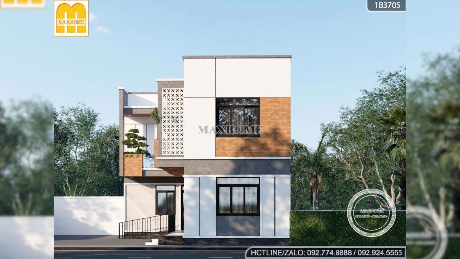 Đối với mẫu nhà phố 2 tầng chữ L, để hạn chế tình trạng hắt mưa vào khu vực ban công, KTS Maxhome đã khéo léo bố trí mảng tường gạch bông gió. Chi tiết này không chỉ giúp chắn mưa, giảm bức xạ nhiệt mà còn đóng vai trò như một yếu tố trang trí thẩm mỹ, tạo điểm nhấn độc đáo cho mặt tiền công trình. Nhờ vậy, ngôi nhà vừa đảm bảo công năng sử dụng, vừa giữ được nét đẹp hiện đại và thông thoáng.