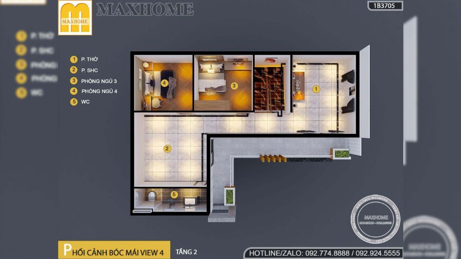 Tầng 2 được bố trí phòng thờ trang nghiêm, có cửa sổ thông thoáng giúp hạn chế ám mùi nhang khói và tạo sự lưu thông không khí. Bên cạnh đó, tầng này gồm hai phòng ngủ được sắp xếp liền kề, mang lại sự thuận tiện trong sinh hoạt. Ngoài ra còn có một phòng sinh hoạt chung làm nơi kết nối các thành viên gia đình, cùng với một nhà vệ sinh chung phục vụ tiện nghi cho cả tầng.