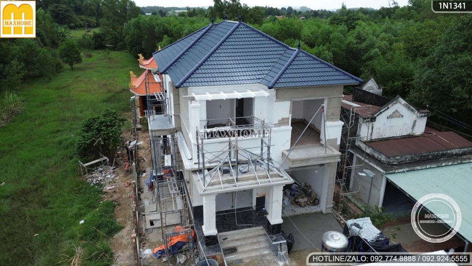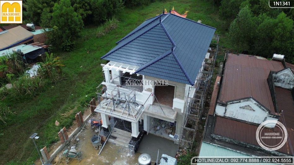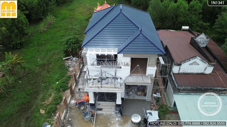 Ngôi nhà mái Nhật 2 tầng hiện đại đã hoàn thiện phần lợp ngói, tạo nên diện mạo vững chãi và tinh tế cho công trình. Hệ mái được thiết kế với độ dốc tiêu chuẩn, giúp thoát nước mưa nhanh chóng, hạn chế tối đa tình trạng thấm dột hay ứ đọng nước trên bề mặt. Ngoài ra, phần mái có độ vươn rộng hợp lý, vừa che nắng, chắn mưa hiệu quả, vừa góp phần bảo vệ tường ngoại thất khỏi tác động của thời tiết. Với thiết kế cân đối và đường nét thanh thoát, mái ngói không chỉ đảm bảo tính bền vững mà còn làm nổi bật vẻ sang trọng, đẳng cấp cho toàn bộ ngôi nhà.