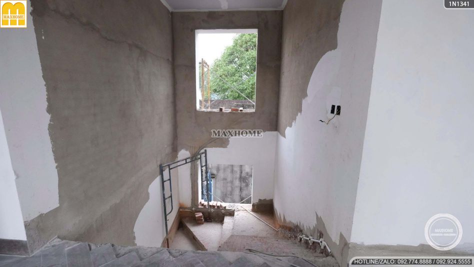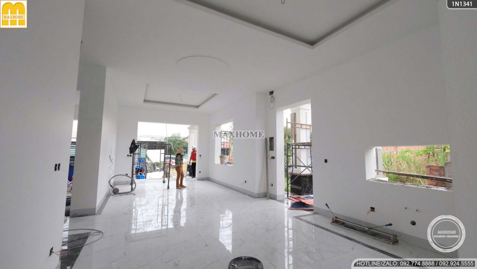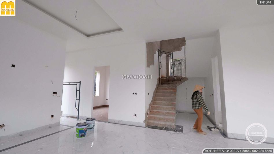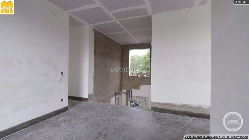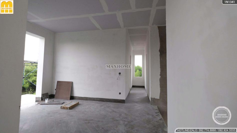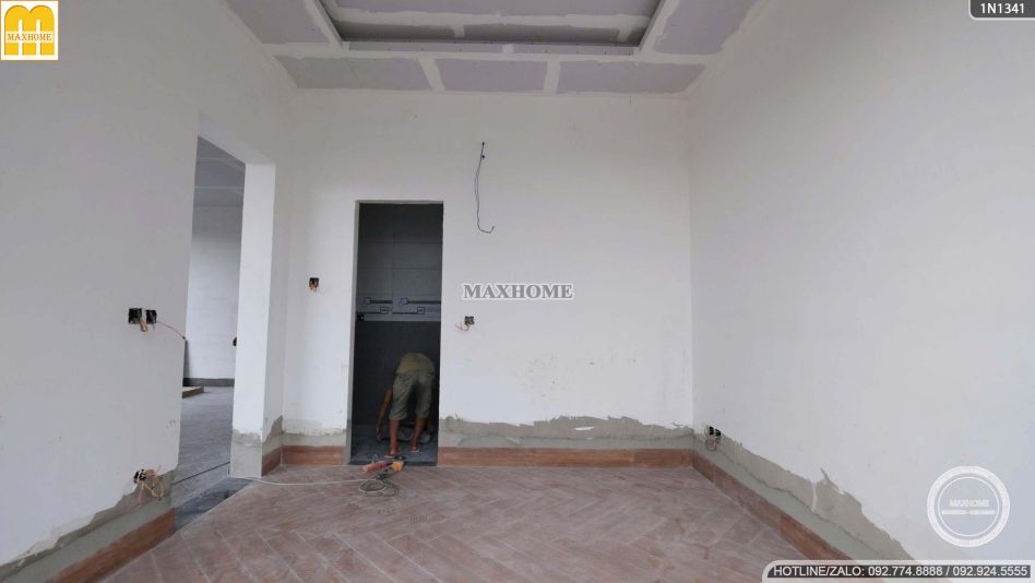 Không gian bên trong ngôi nhà mái Nhật đã được hoàn thiện với lớp sơn nội thất tinh tế, mang lại cảm giác sạch sẽ và hiện đại. Toàn bộ hệ thống gạch nền cũng đã được ốp lát xong, đảm bảo bề mặt phẳng mịn, dễ vệ sinh và có tính thẩm mỹ cao. Sự kết hợp hài hòa giữa màu sơn và gạch lát giúp không gian nội thất trở nên ấm cúng, sang trọng hơn, đồng thời thể hiện sự tỉ mỉ và chuyên nghiệp trong từng khâu thi công của đội ngũ Maxhome.