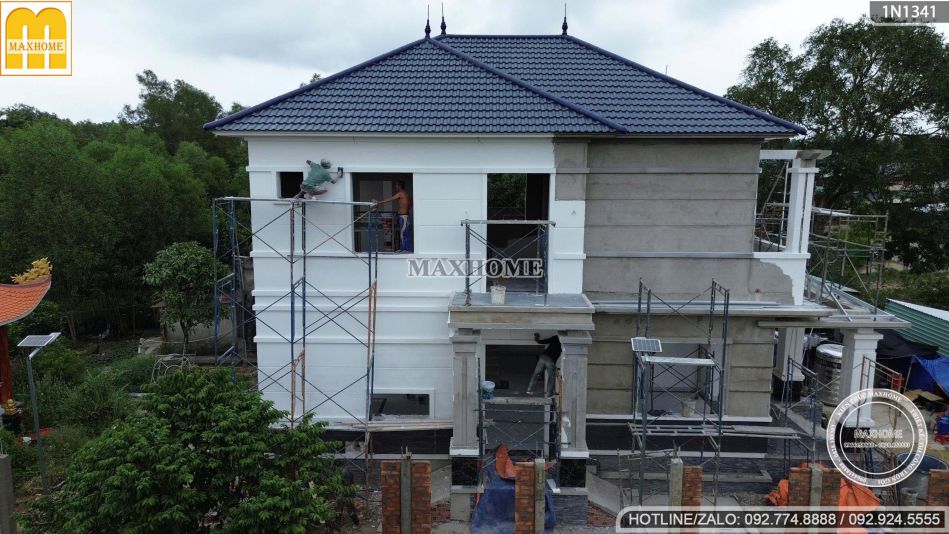 Hiện tại, ngôi nhà mái Nhật 2 tầng đang trong giai đoạn hoàn thiện phần sơn ngoại thất sau khi đã hoàn tất công đoạn tô trát tường. Đây là bước quan trọng giúp bề mặt tường được bảo vệ tốt hơn trước tác động của thời tiết, đồng thời mang lại vẻ đẹp thẩm mỹ cho tổng thể công trình. Khi lớp sơn được hoàn thiện, ngôi nhà sẽ khoác lên mình diện mạo mới hiện đại, tinh tế và bền màu theo thời gian.