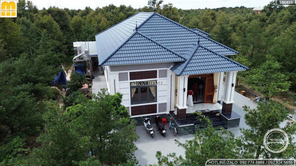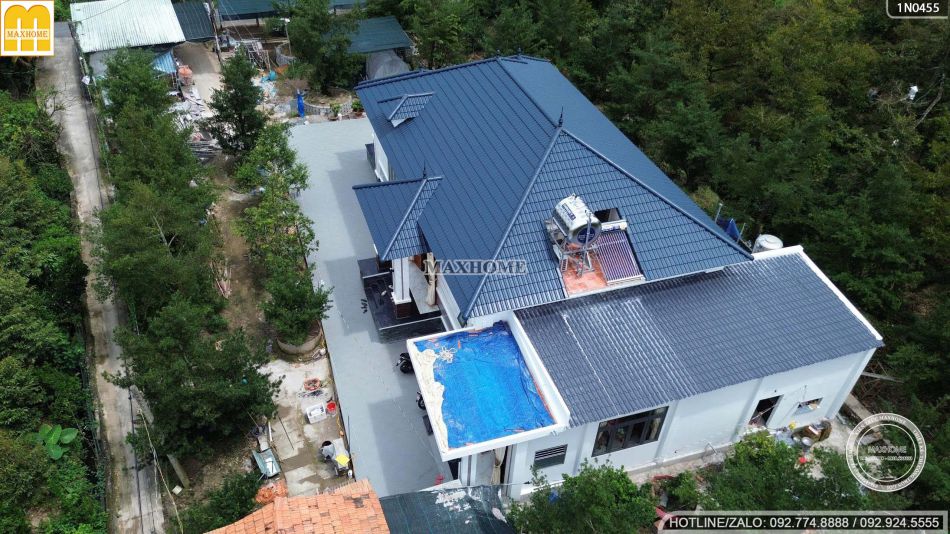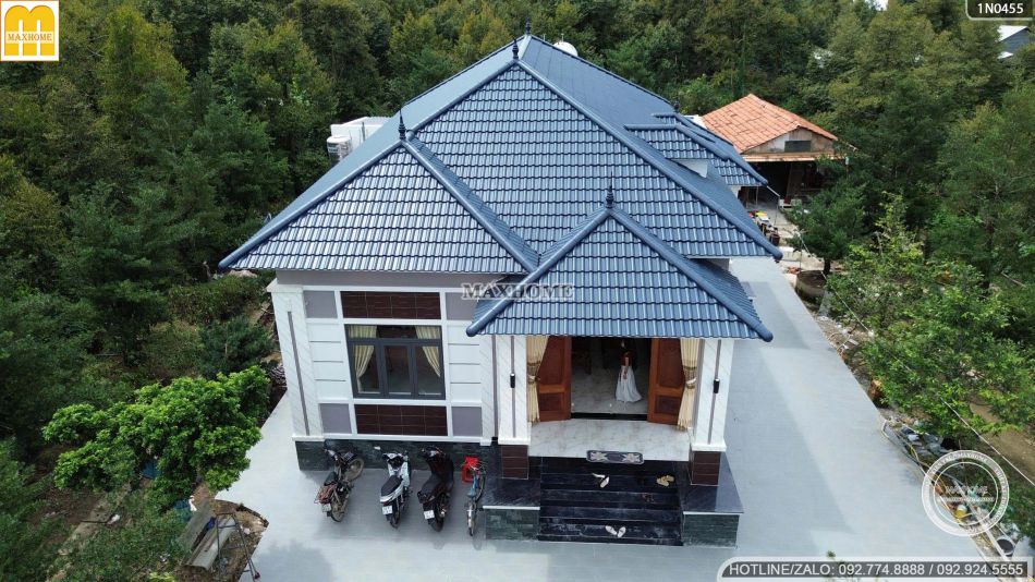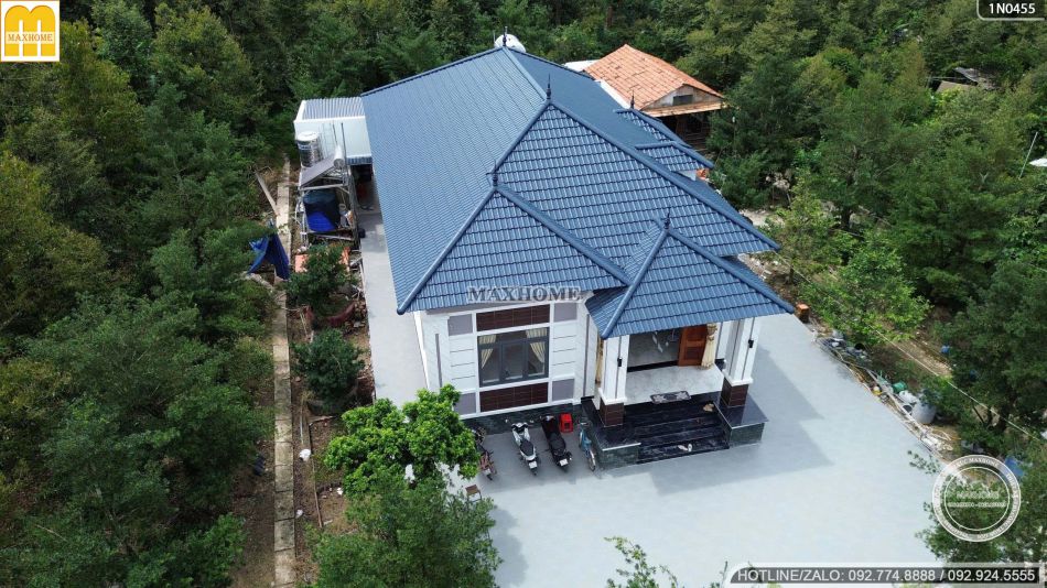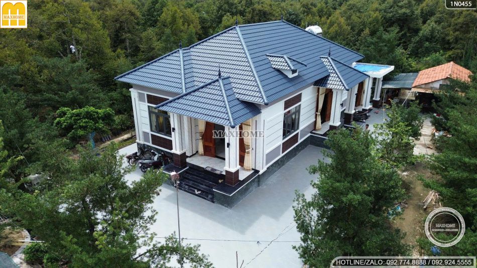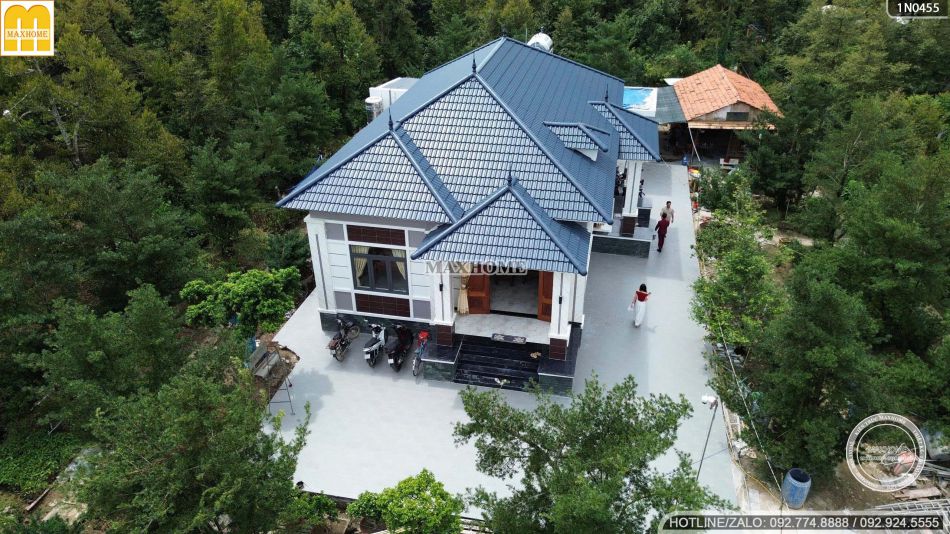 Ngôi nhà vườn mái Nhật được thi công với hệ mái lắp ghép tỉ mỉ và tinh chỉnh cẩn thận trong từng chi tiết, đảm bảo độ bền và tính thẩm mỹ cao. Phần mái sử dụng tông màu xanh nổi bật, tạo điểm nhấn thu hút cho tổng thể công trình, đồng thời mang đến cảm giác mát mẻ, gần gũi với thiên nhiên. Thiết kế mái Nhật không chỉ giúp thoát nước tốt, chống nóng hiệu quả mà còn góp phần hoàn thiện vẻ đẹp thanh thoát, sang trọng cho ngôi nhà.