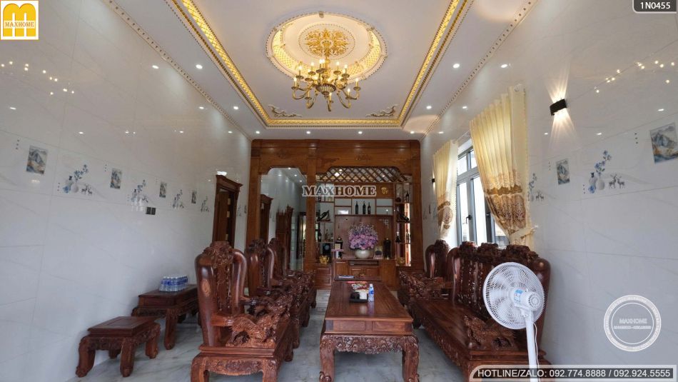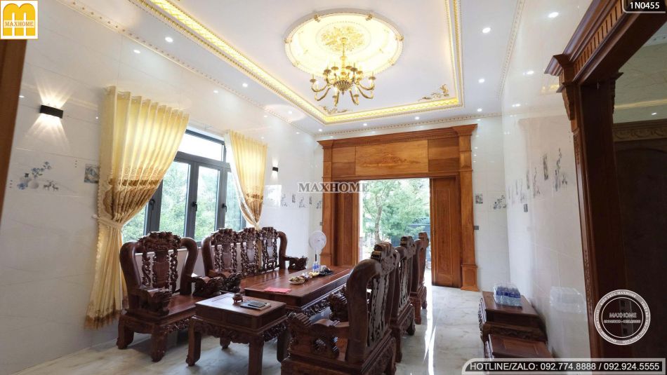 Phòng khách được thiết kế ấn tượng với bộ sofa làm từ gỗ cẩm lai cao cấp, nổi bật bởi những đường vân tự nhiên tinh xảo và sang trọng. Không gian nội thất mang hơi hướng tân cổ điển nhẹ nhàng, kết hợp hài hòa giữa vẻ đẹp truyền thống và nét hiện đại tinh tế. Cách bài trí tinh gọn, cùng ánh sáng tự nhiên chan hòa từ cửa sổ lớn, giúp phòng khách trở nên ấm cúng, đồng thời thể hiện rõ gu thẩm mỹ và đẳng cấp của gia chủ.