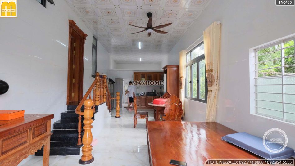 Mẫu nhà vườn mái Nhật được thiết kế thông minh với khoảng không gian phía sau bố trí khu bếp và công trình phụ, giúp tối ưu diện tích sử dụng và mang lại sự tiện nghi trong sinh hoạt. Việc đặt bếp ở phía sau không chỉ tạo cảm giác thông thoáng, rộng rãi hơn cho không gian chính, mà còn giúp hạn chế tình trạng ám mùi trong khu vực sinh hoạt chung. Cách bố trí này thể hiện sự tinh tế trong thiết kế của Maxhome, vừa đảm bảo công năng, vừa giữ được tính thẩm mỹ và phong thủy hài hòa cho tổng thể ngôi nhà.