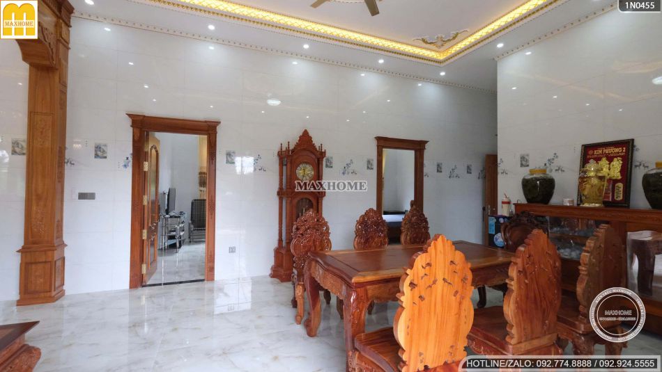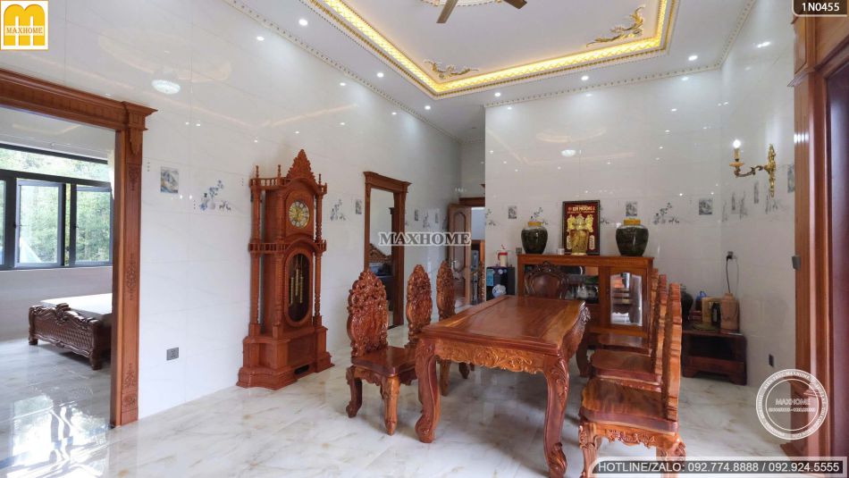 Đây là khu vực phòng ăn, nơi nổi bật với bộ bàn ăn được chế tác từ gỗ xà cừ tự nhiên có độ bền cao và vân gỗ đẹp mắt. Có thể thấy, gia chủ là người đặc biệt yêu thích chất liệu gỗ, nên hầu hết các không gian trong ngôi nhà đều sử dụng gỗ làm điểm nhấn chủ đạo. Sự xuất hiện của chất liệu này không chỉ mang lại cảm giác ấm cúng và gần gũi, mà còn thể hiện gu thẩm mỹ tinh tế cùng phong cách sống sang trọng của gia chủ.