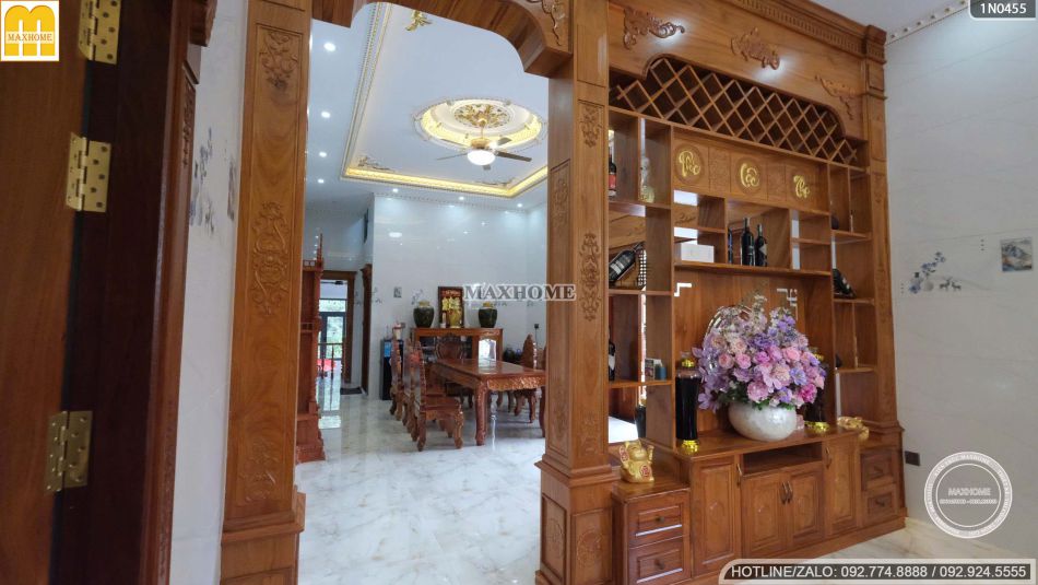Tại khu vực ngăn cách giữa phòng khách và phòng ăn, kiến trúc sư đã khéo léo bố trí hệ lam gỗ làm từ chất liệu gỗ gõ đỏ cao cấp, mang lại vẻ đẹp sang trọng và tinh tế cho không gian. Hệ lam không chỉ đóng vai trò phân chia không gian một cách nhẹ nhàng, tạo sự riêng tư vừa đủ, mà còn được tận dụng để trưng bày rượu và vật phẩm trang trí, giúp tăng tính thẩm mỹ và thể hiện gu thưởng thức tinh tế của gia chủ.