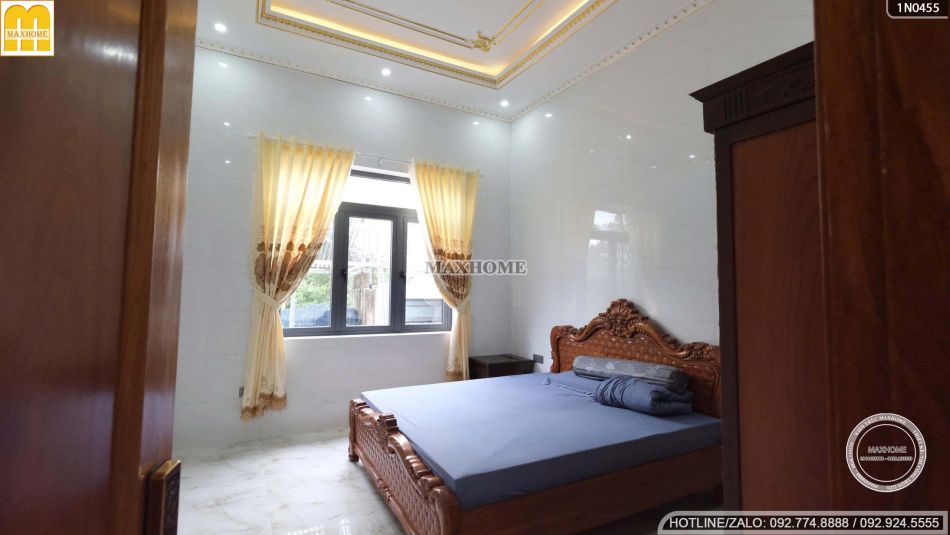 Phòng ngủ được thiết kế sang trọng với toàn bộ nội thất làm từ gỗ tự nhiên cao cấp, từ giường ngủ, tủ quần áo cho đến hệ thống cửa ra vào, tạo nên không gian ấm cúng và đồng bộ. Các chi tiết gỗ được xử lý tinh tế, bề mặt phủ sơn bóng mịn giúp tăng độ bền và chống mối mọt, đồng thời mang lại vẻ đẹp sang trọng, gần gũi với thiên nhiên cho không gian nghỉ ngơi của gia chủ.