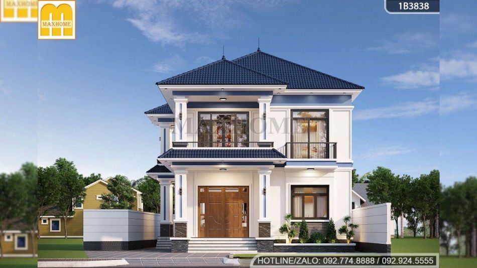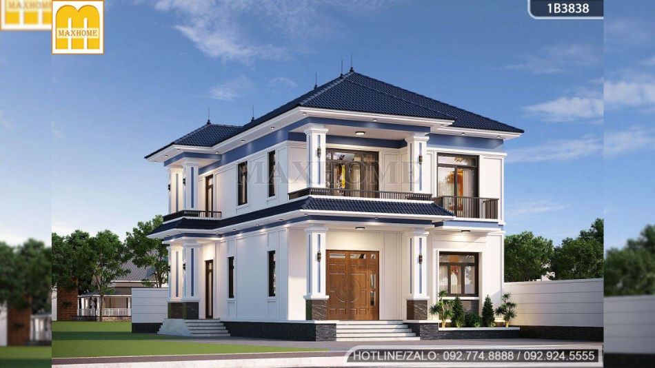 Ngôi nhà 2 tầng mái Nhật gây ấn tượng với cách phối màu hài hòa, trong đó gam trắng được sử dụng làm tông màu chủ đạo, mang đến vẻ đẹp thanh lịch, hiện đại và không bao giờ lỗi thời. Các mảng tường được tạo điểm nhấn bằng sắc xanh nhẹ tại khu vực tiếp giáp sàn tầng 1 và phần diềm mái, giúp tổng thể công trình trở nên có chiều sâu và cuốn hút hơn. Hệ cột chính được thiết kế vuông vức, khỏe khoắn, kết hợp các đường kẻ chỉ màu xanh ở trung tâm, vừa tăng giá trị thẩm mỹ vừa khẳng định sự vững chãi và bền bỉ – đặc trưng nổi bật của kiến trúc nhà mái Nhật.