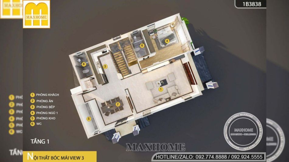 Tầng 1 gồm phòng khách bố trí ngay lối vào, tiếp đến là phòng ăn có cửa phụ ra bên hông, đối diện là khu vực bếp diện tích 9m² được sắp xếp gọn gàng. Bên cạnh là nhà vệ sinh chung, cuối nhà bố trí khu giặt – phơi kết hợp phòng kho. Ngoài ra, tầng 1 còn có 1 phòng ngủ với nhà vệ sinh khép kín, phù hợp cho người lớn tuổi hoặc khách lưu trú.