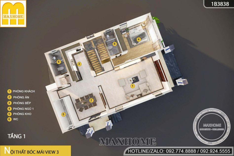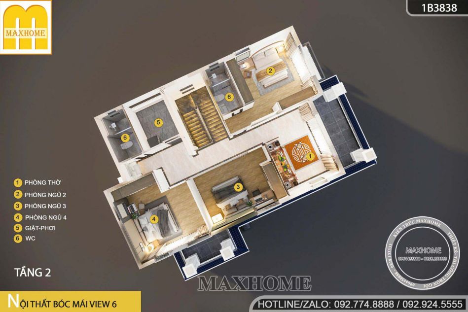 Xung quanh là 3 phòng ngủ được sắp xếp khoa học, đáp ứng nhu cầu nghỉ ngơi của các thành viên trong gia đình. Trong đó, phòng ngủ 02 được thiết kế nhà vệ sinh khép kín, giúp tăng tính tiện nghi và riêng tư khi sử dụng. Cuối nhà là khu vực nhà vệ sinh chung kết hợp phòng giặt – phơi, bố trí gọn gàng, tách biệt, đảm bảo thuận tiện trong sinh hoạt hằng ngày mà vẫn giữ được sự thông thoáng cho toàn bộ tầng lầu.