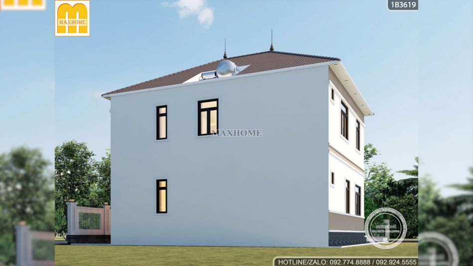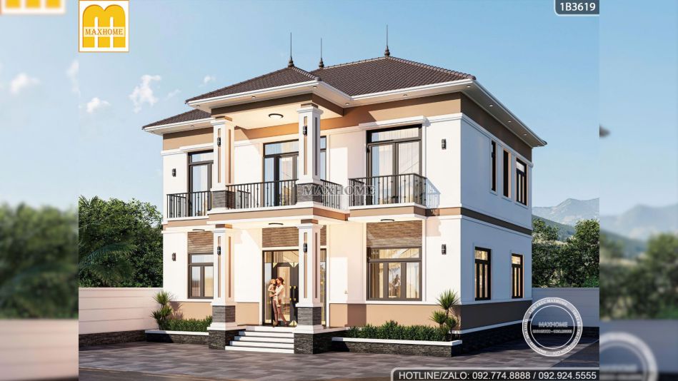 Hệ cửa kính lớn được bố trí đều ở cả 2 tầng góp phần làm cho ngoại thất ngôi nhà trở nên sáng sủa và thoáng mát hơn rất nhiều. Cửa đi và cửa sổ sử dụng khung màu đen để tạo sự tương phản nhẹ với màu tường trắng sáng giúp tổng thể không bị đơn điệu. Ngoài ra công tình cũng sử dụng thêm màu sơn nâu ấm áp xen kẽ màu trắng để giảm bớt sự nhàm chán của phần ngoại thất. Đây chính là điểm mạnh của mẫu nhà 2 tầng ở quê, khi tận dụng tối đa ánh sáng tự nhiên và màu sắc để mang lại cảm giác dễ chịu cho người ở.