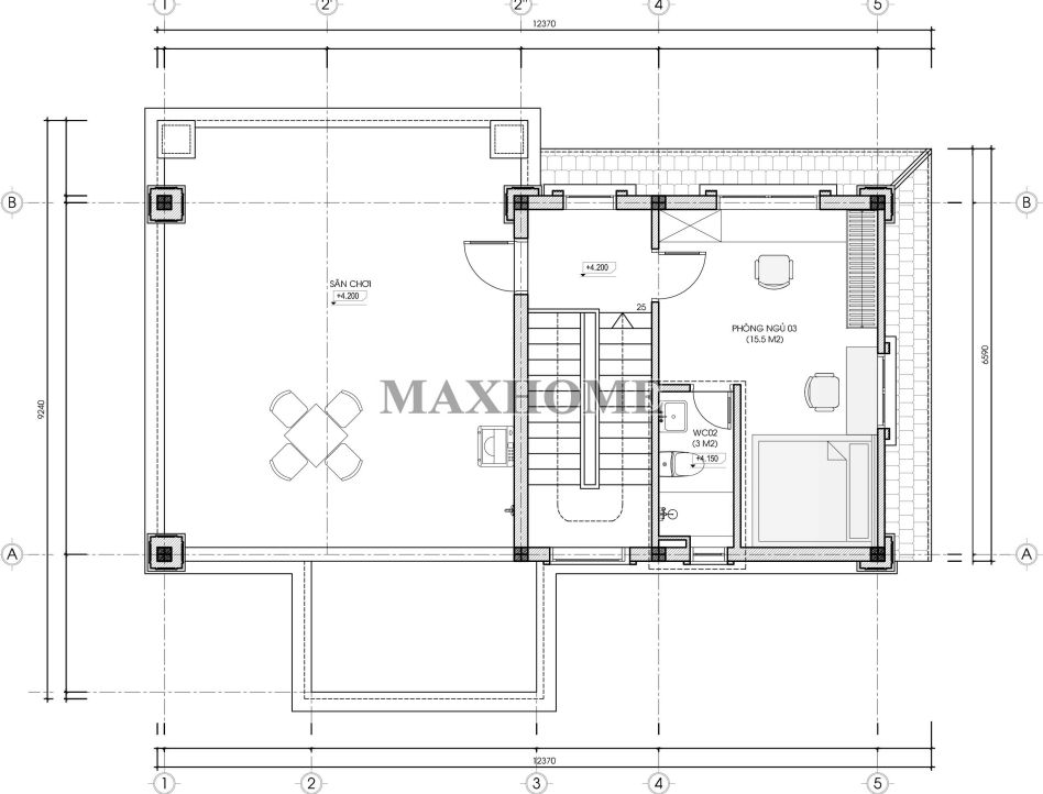 Bên ngoài phòng là khu vực sân chơi rộng rãi, đóng vai trò như một không gian sinh hoạt ngoài trời lý tưởng. Gia chủ có thể tận dụng nơi đây để trồng cây xanh, đặt bàn trà thư giãn hoặc tạo khu vui chơi an toàn cho trẻ nhỏ. Sự kết hợp giữa không gian trong nhà và khoảng sân mở giúp tầng 2 luôn thoáng đãng, đón gió và ánh sáng tự nhiên hiệu quả.