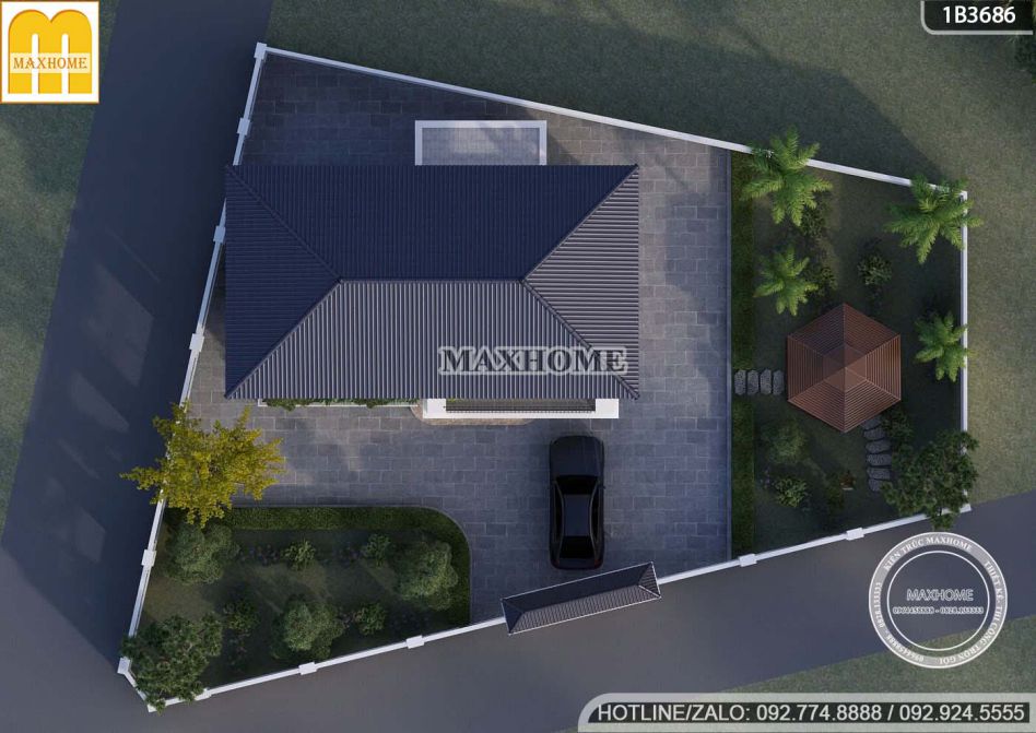 Nhìn từ trên cao, hệ mái Nhật màu xanh than trở thành điểm nhấn nổi bật, tôn lên vẻ đẹp thanh lịch và hiện đại cho toàn bộ công trình. Tông màu trầm không chỉ tạo chiều sâu cho kiến trúc mà còn hài hòa với tổng thể mặt tiền và cảnh quan xung quanh. Phần mái sử dụng ngói mái Nhật chất lượng cao, có độ bền tốt và khả năng chống thấm hiệu quả. Nhờ thiết kế độ dốc hợp lý, nước mưa được thoát nhanh, hạn chế tình trạng ứ đọng gây thấm dột. Đây là giải pháp vừa đảm bảo tính thẩm mỹ, vừa nâng cao tuổi thọ công trình và giảm chi phí bảo trì trong quá trình sử dụng lâu dài.