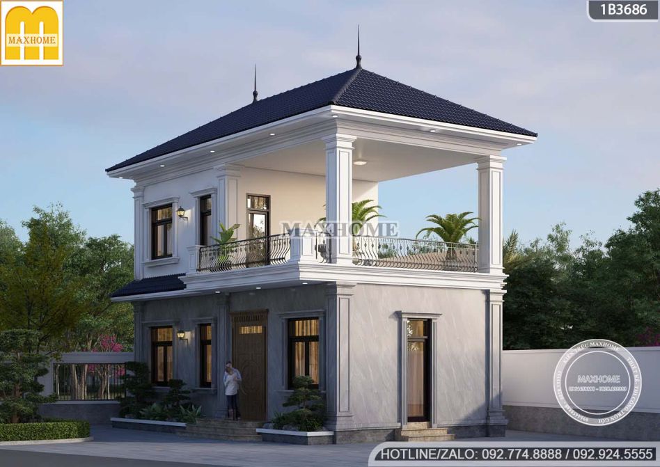 Mẫu nhà 2 tầng mái Nhật sở hữu mặt tiền rộng 11,6m, tạo lợi thế lớn trong việc bố trí hình khối kiến trúc và sắp xếp các chi tiết trang trí một cách cân đối, hài hòa. Nhờ chiều ngang ấn tượng, mặt tiền trở nên thông thoáng, dễ dàng kết hợp hệ cửa, ban công và các mảng tường nhấn mà không gây cảm giác chật chội.