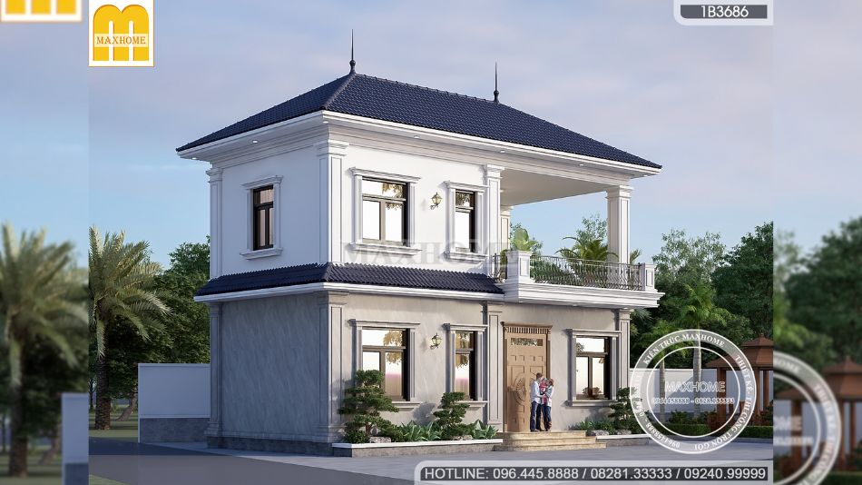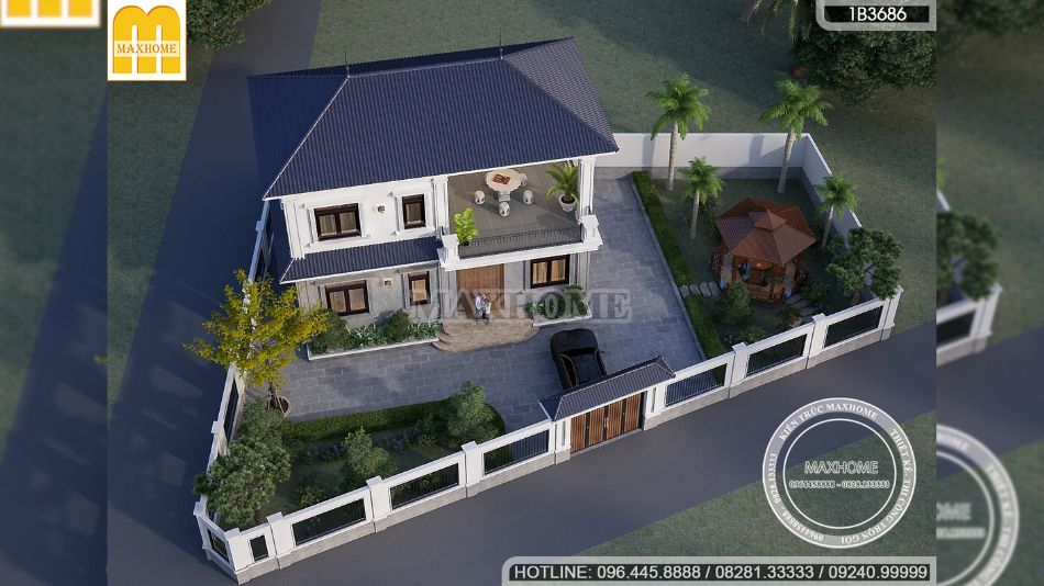 Nhìn từ trên cao, hệ mái Nhật màu xanh than trở thành điểm nhấn nổi bật, tôn lên vẻ đẹp thanh lịch và hiện đại cho toàn bộ công trình. Tông màu trầm không chỉ tạo chiều sâu cho kiến trúc mà còn hài hòa với tổng thể mặt tiền và cảnh quan xung quanh. Phần mái sử dụng ngói mái Nhật chất lượng cao, có độ bền tốt và khả năng chống thấm hiệu quả. Nhờ thiết kế độ dốc hợp lý, nước mưa được thoát nhanh, hạn chế tình trạng ứ đọng gây thấm dột. Đây là giải pháp vừa đảm bảo tính thẩm mỹ, vừa nâng cao tuổi thọ công trình và giảm chi phí bảo trì trong quá trình sử dụng lâu dài.
