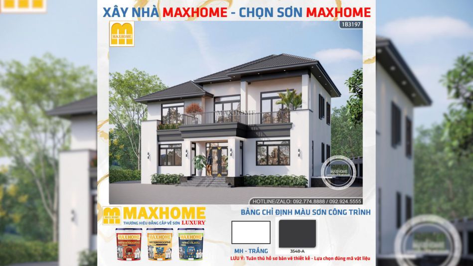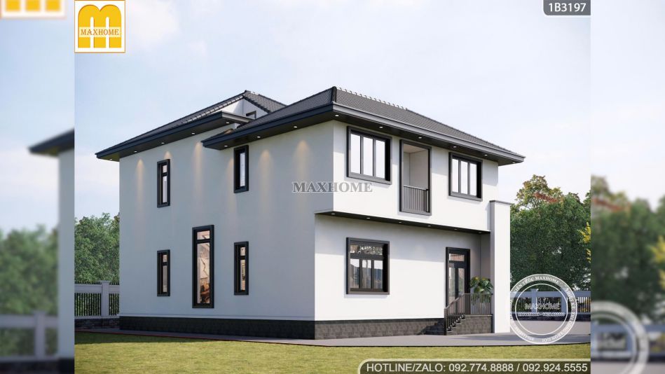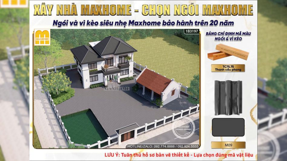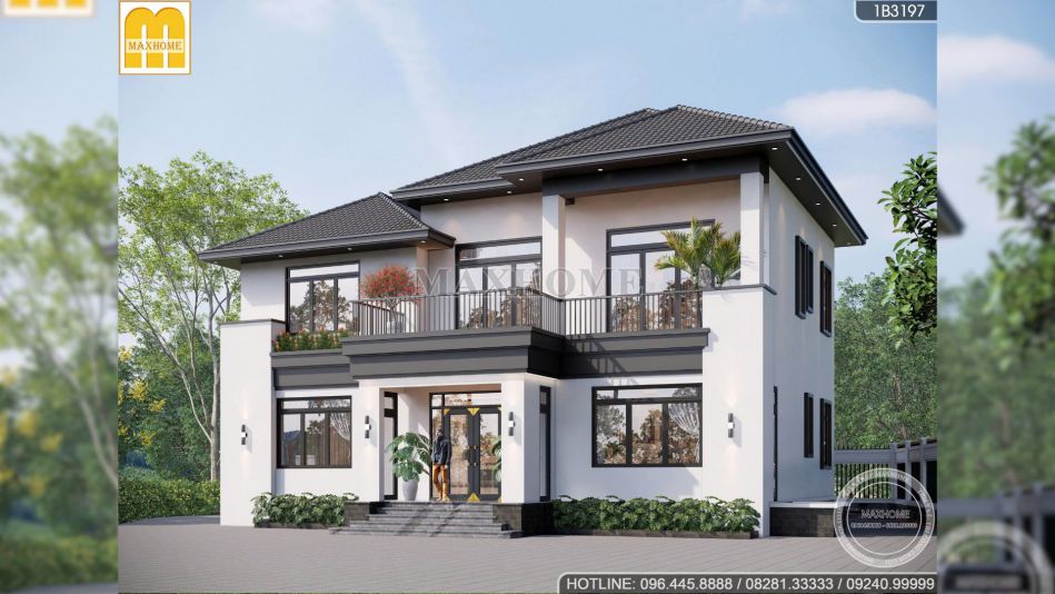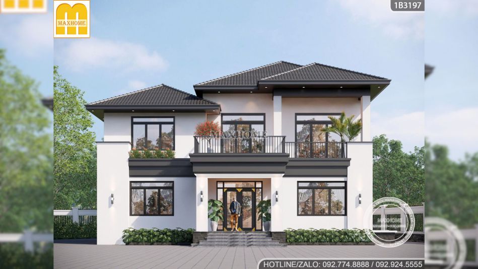 Biệt thự của anh Hoàng ở Thanh Hoá là một trong những mẫu biệt thự nghỉ dưỡng 2 tầng nổi bật ở Maxhome nhờ sự cân bằng giữa hiện đại, sang trọng và không gian sống gắn với thiên nhiên. Với tổng diện tích hai mặt sàn 286m2, công trình gây ấn tượng ngay từ cái nhìn đầu tiên bằng hình khối gọn gàng, mái Nhật tối màu và phong cách thiết kế hướng đến sự thoáng mở.