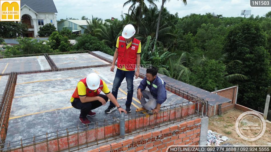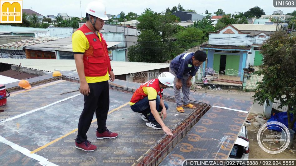 Trên mái, các kỹ sư mặc đồng phục Maxhome nổi bật áo phản quang đỏ đang tỉ mỉ kiểm tra từng thanh thép. Mọi công đoạn đều được ghi chép cẩn thận và đảm bảo đúng tiêu chuẩn trước khi khâu đổ bê tông bắt đầu. Đây là một trong những khâu quan trọng nhất để bảo đảm độ bền và an toàn cho toàn bộ công trình nhà 1 tầng 1 hầm.