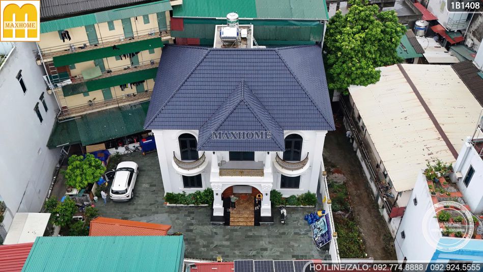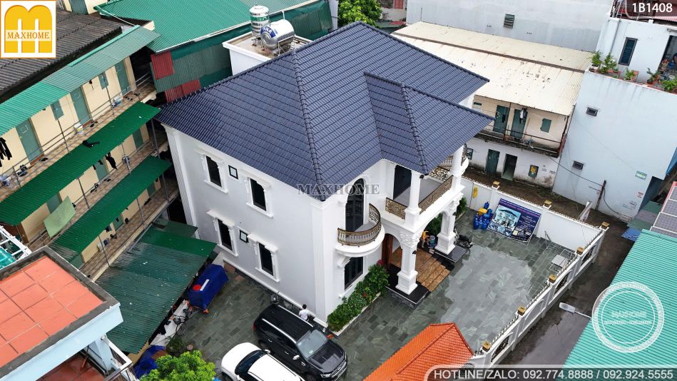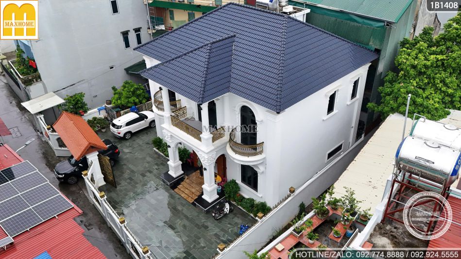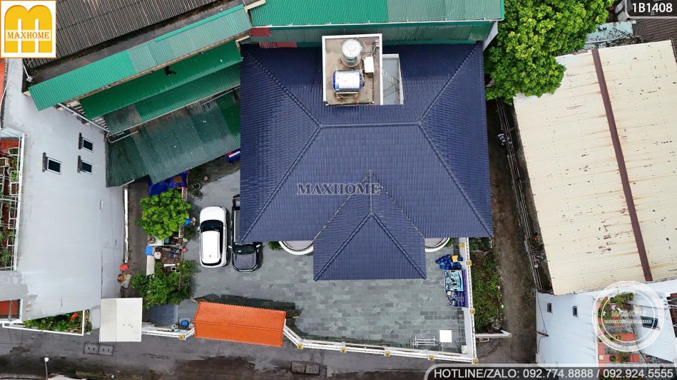 Nhìn từ trên cao, công trình nhà vườn mái Nhật tân cổ điển hiện lên với hệ mái ngói xanh sang trọng tạo cảm giác tươi mát và nhẹ nhàng. Phần nền nhà được nâng cao đi kèm bậc thềm 5 bậc thềm lát đá Granite giúp tổng thể trở nên cao ráo và vững chãi.