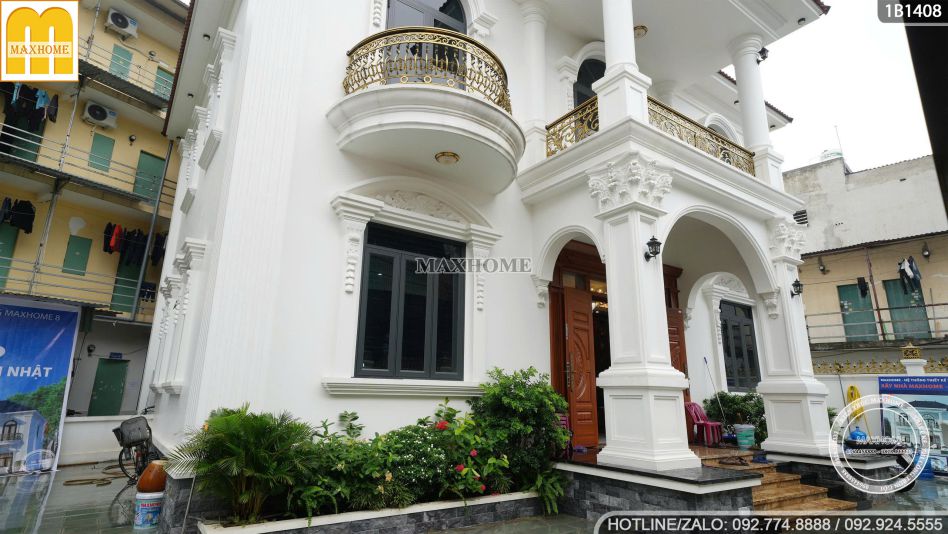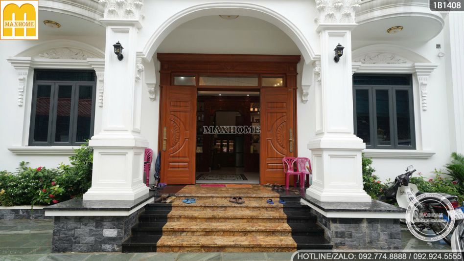 Hệ cột trụ lớn vuông vức được dựng chắc chắn, bên cạnh điểm thêm những hoa văn tinh tế ở đầu cột mang nét đặc trưng của phong cách tân cổ điển. Cửa chính làm từ thép vân gỗ bốn cánh lớn đóng mở nhẹ nhàng, bền màu và không cong vênh theo thời gian.