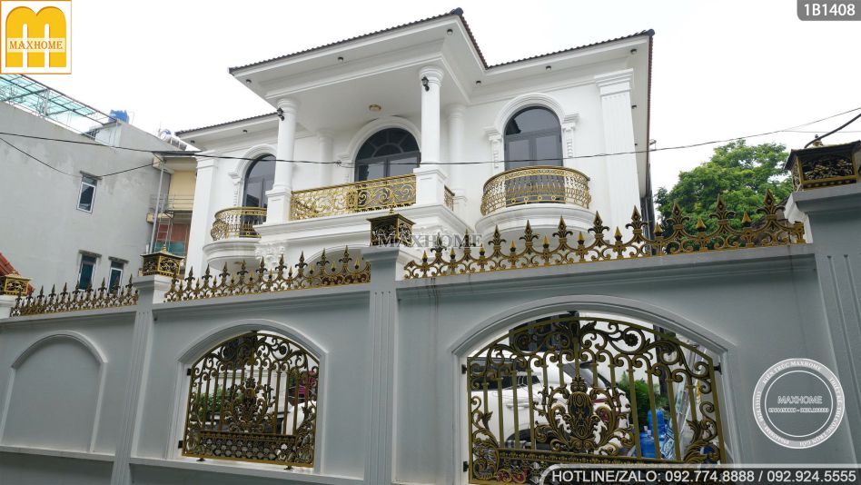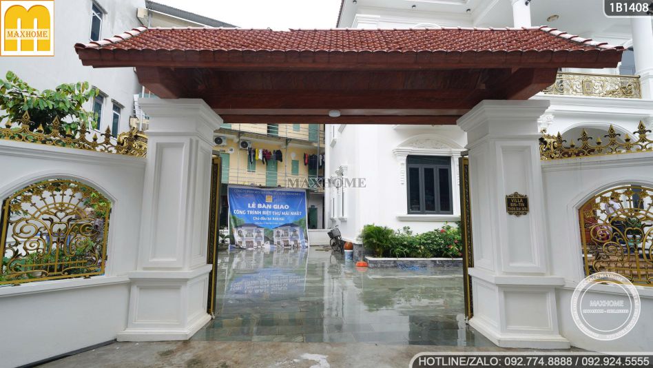 Ngay từ cổng bước vào, bất kể vị khách tới chơi cũng sẽ bị thu hút bởi cánh cổng nhôm đúc nghệ thuật tinh xảo được thiết kế đồng điệu với lan can ban công của mẫu nhà đẹp với các chi tiết uốn cong mềm mại và sơn mạ vàng sang trọng. Mái cổng lợp ngói đỏ truyền thống giúp giữ được nét cổ điển và hòa hợp với tổng thể hiện đại.