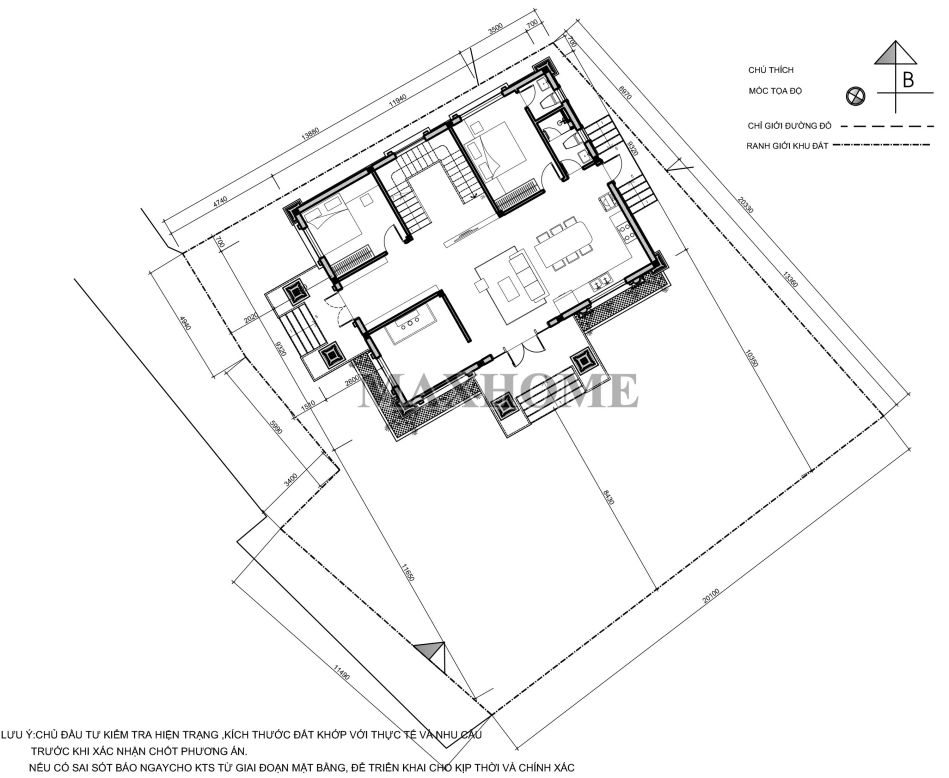 Dựa vào mặt bằng định vị, công trình nằm ở hướng Đông Bắc, có kích thước 13,5 x 11,3m. Với tổng diện tích 220m², công năng sử dụng được bố trí hợp lý và khoa học, cùng với các ô cửa sổ lớn giúp cho ngôi nhà có đủ ánh sáng tự nhiên, không gian sống vô cùng thông thoáng và thoải mái.