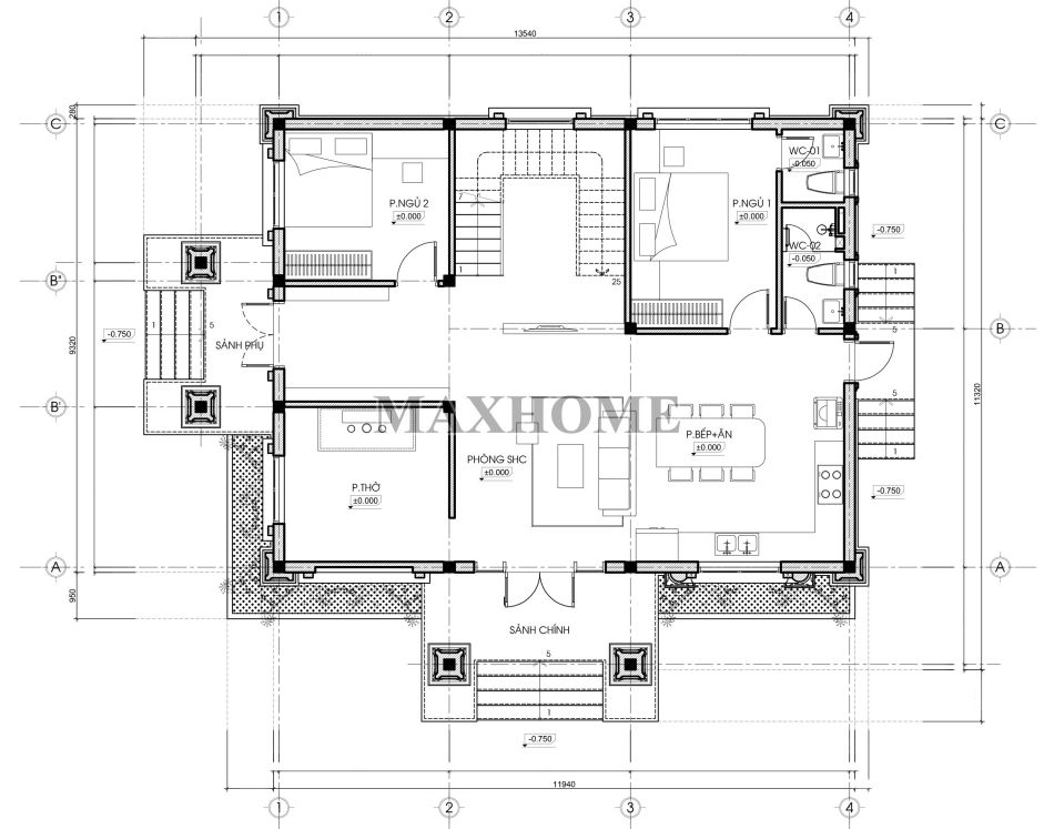 • Tầng 1: Phòng khách, phòng thờ, phòng bếp, 2 phòng ngủ, 2 wc