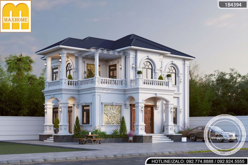 Trên tầng 2 và khu vực sảnh ban công, các cột tròn thanh thoát xuất hiện, tạo nên sự mềm mại cần thiết. Sự chuyển đổi từ vuông sang tròn không chỉ mang tính thẩm mỹ mà còn giúp công trình tránh cảm giác thô cứng. Những hàng cột này kết hợp cùng hệ lan can con tiện trắng tạo nên một mặt đứng đầy chiều sâu, gợi liên tưởng đến kiến trúc châu Âu cổ điển nhưng đã được tiết chế phù hợp với đời sống hiện đại.
