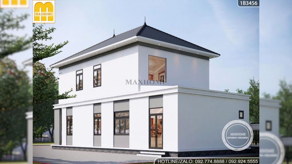 Mẫu nhà đẹp gây ấn tượng bởi lối thiết kế hình khối vuông vức cùng các đường nét kiến trúc dứt khoát nhưng vẫn đảm bảo được sự thanh thoát nhờ hệ thống cột trụ và các mảng tường được phân chia tỉ lệ vàng.