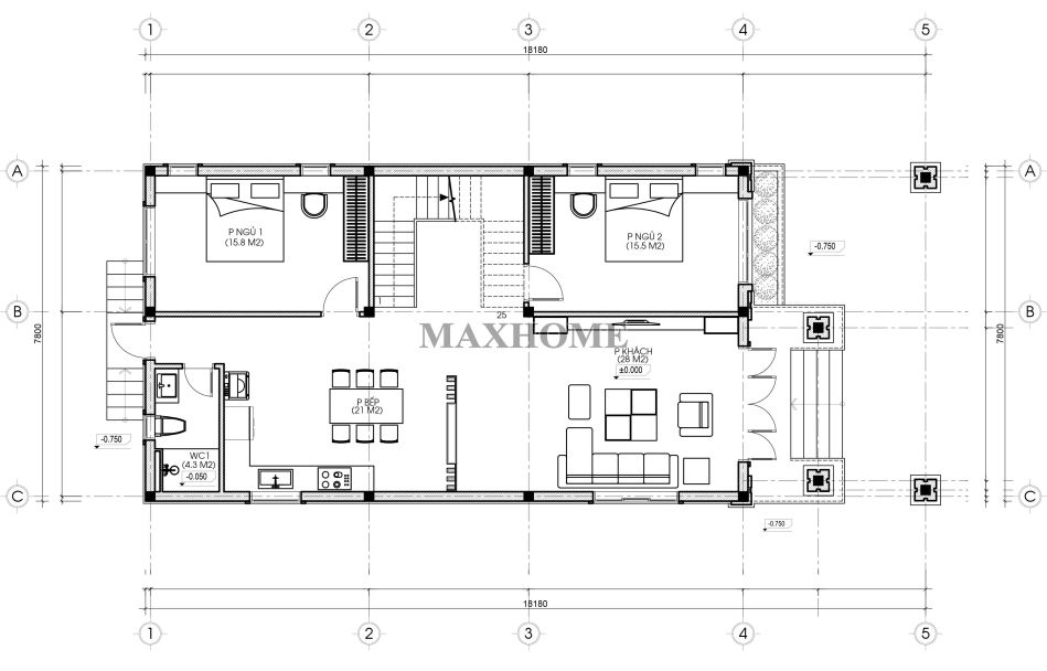 Trong quá trình lên phương án thiết kế, đội ngũ kiến trúc sư Maxhome đã nghiên cứu kỹ lưỡng việc phân bổ hệ thống cửa sổ tại các vị trí phù hợp nhằm tăng cường khả năng thông gió tự nhiên, giúp không gian bên trong luôn thông thoáng và mát mẻ. Đồng thời, cách bố trí này còn tận dụng tối đa nguồn ánh sáng tự nhiên, góp phần tiết kiệm năng lượng và nâng cao chất lượng sinh hoạt cho gia đình. Bên cạnh cửa chính sử dụng cửa thép vân gỗ chắc chắn, an toàn và có tính thẩm mỹ cao, các hệ cửa còn lại được lựa chọn nhôm Xingfa kết hợp kính cường lực, không chỉ đảm bảo độ bền, cách âm, cách nhiệt tốt mà còn mang lại vẻ đẹp hiện đại, sang trọng cho tổng thể ngôi nhà.