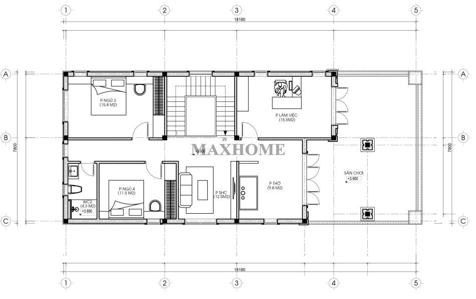 Tầng 2 được bố trí với không gian phòng thờ trang nghiêm, đặt ở vị trí yên tĩnh và hợp phong thủy, thể hiện sự tôn kính của gia chủ đối với đời sống tâm linh. Bên cạnh đó là phòng làm việc được sắp xếp hướng ra khu vực sân chơi, mang lại cảm giác thông thoáng, nhiều ánh sáng tự nhiên, tạo môi trường lý tưởng cho học tập và làm việc. Phần diện tích còn lại là khu vực nghỉ ngơi với 2 phòng ngủ đặt về phía cuối nhà, đảm bảo sự riêng tư và yên tĩnh, sử dụng chung 1 nhà vệ sinh được bố trí khoa học, thuận tiện cho sinh hoạt hàng ngày của các thành viên trong gia đình.