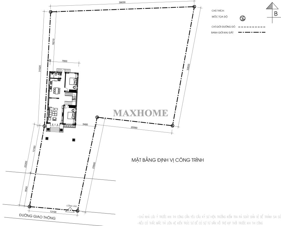 Mặt bằng định vị công trình thể hiện rõ vị trí xây dựng mẫu nhà 2 tầng mái Nhật với kích thước khoảng 7,8 × 18,1m, được bố trí hợp lý trên khu đất nhằm tối ưu không gian sử dụng và khoảng thoáng xung quanh. Với tổng diện tích sử dụng khoảng 215m², ngôi nhà đáp ứng đầy đủ nhu cầu sinh hoạt cho gia đình nhiều thế hệ, đảm bảo sự tiện nghi, riêng tư nhưng vẫn gắn kết giữa các thành viên. Cách sắp xếp mặt bằng khoa học còn giúp quá trình di chuyển trong nhà thuận tiện, đồng thời tạo nền tảng cho việc bố trí công năng linh hoạt và hiệu quả lâu dài.