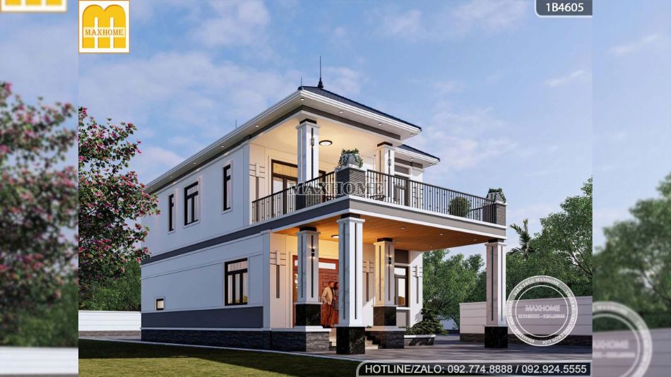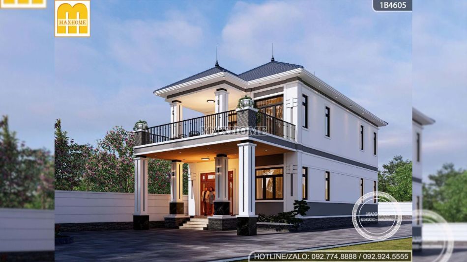 Gam màu trắng tiếp tục được Maxhome lựa chọn làm tông màu chủ đạo, mang đến cảm giác tinh tế, sang trọng và giúp tổng thể công trình luôn sáng thoáng theo thời gian. Để tránh sự đơn điệu, các mảng màu ghi được nhấn nhá khéo léo tại diện tường và những đường kẻ trang trí trên thân cột, tạo chiều sâu thị giác và làm nổi bật các chi tiết kiến trúc. Khu vực trần hiên sử dụng vật liệu gỗ nhựa ngoài trời, vừa đảm bảo độ bền, khả năng chống ẩm, vừa tăng tính thẩm mỹ ấm áp. Kết hợp cùng hệ thống đèn chiếu sáng bố trí hợp lý, không gian nhà 2 tầng mái Nhật trở nên nổi bật, sang trọng và cuốn hút hơn, đặc biệt vào buổi tối.
