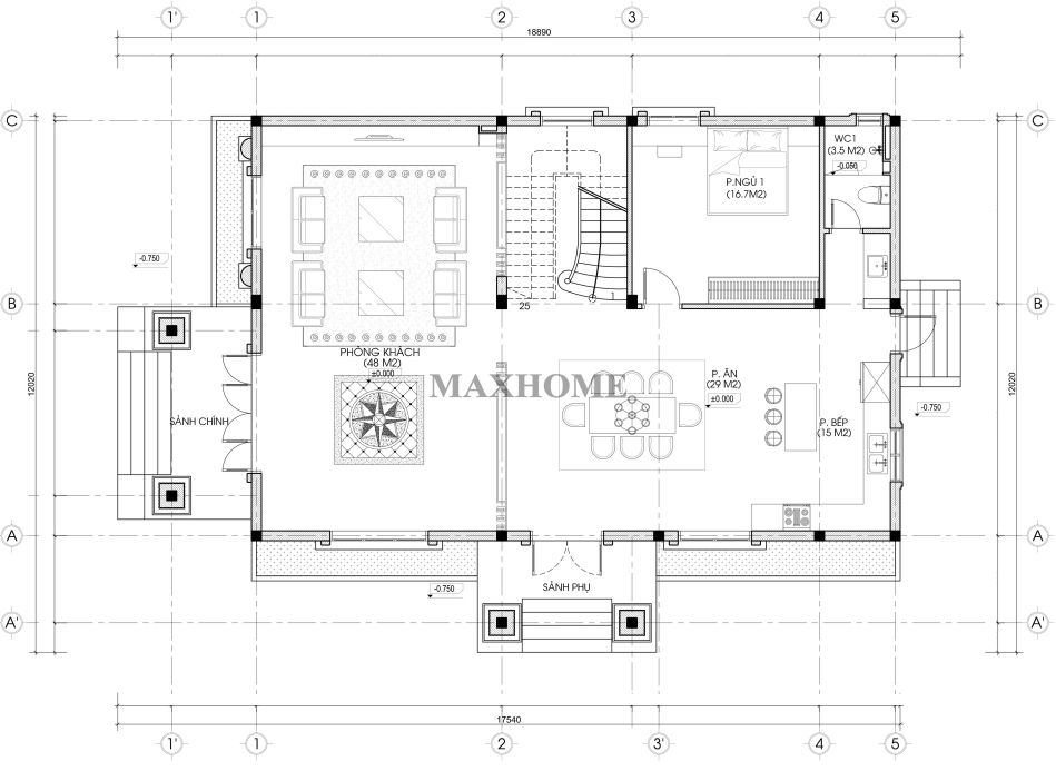 Tầng 1 được bố trí không gian phòng khách rộng rãi với diện tích lên đến 48 m², tạo cảm giác thông thoáng và thuận tiện cho việc tiếp đón khách cũng như sinh hoạt chung của gia đình. Tiếp nối phía trong là khu vực bếp và phòng ăn có diện tích lớn, được sắp xếp khoa học và kết nối linh hoạt với lối đi qua sảnh phụ, giúp việc di chuyển và thông gió trở nên thuận tiện hơn. Ngoài ra, tầng 1 còn bố trí một phòng ngủ yên tĩnh, nằm liền kề nhà vệ sinh chung, phù hợp cho người lớn tuổi hoặc khách lưu trú, đảm bảo sự tiện nghi trong quá trình sử dụng.