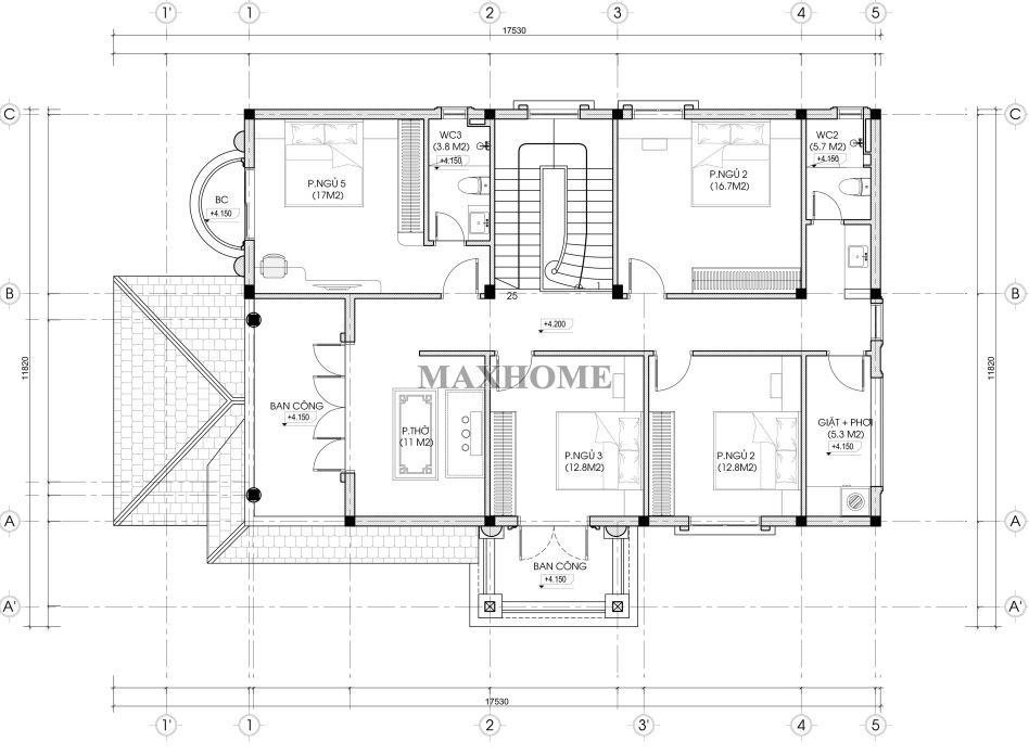 Tầng 2 được bố trí phòng thờ trang nghiêm, đặt ở vị trí cao ráo và hướng ra ban công thoáng mát, tạo sự yên tĩnh và tôn nghiêm trong sinh hoạt tâm linh. Bao quanh khu vực này là 4 phòng ngủ được sắp xếp khoa học, đảm bảo sự riêng tư và thông thoáng cho từng không gian. Trong đó, phòng ngủ số 05 được thiết kế nhà vệ sinh khép kín bên trong, mang lại sự tiện nghi tối đa, còn các phòng ngủ còn lại sử dụng chung một nhà vệ sinh và khu vực giặt phơi, đáp ứng đầy đủ nhu cầu sinh hoạt của cả gia đình.