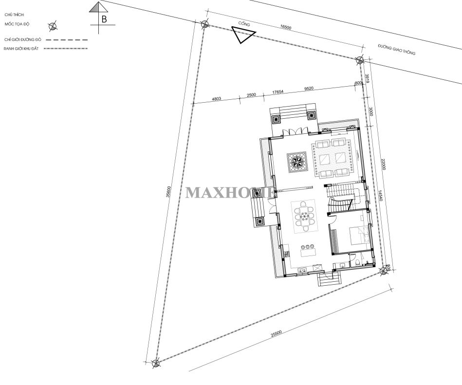 Công trình biệt thự mái Nhật được xây dựng trên khuôn viên đất rộng rãi với kích thước 12 × 18,8m, mang đến không gian sân vườn thoáng đãng và tách biệt. Nhờ lợi thế quỹ đất lớn, các khu vực chức năng được bố trí khoa học, đảm bảo sự thông thoáng và tiện nghi trong quá trình sử dụng. Tổng diện tích sử dụng của toàn bộ công trình ước tính khoảng 389m², đáp ứng tốt nhu cầu sinh hoạt, nghỉ ngơi và nâng cao chất lượng sống cho gia đình.