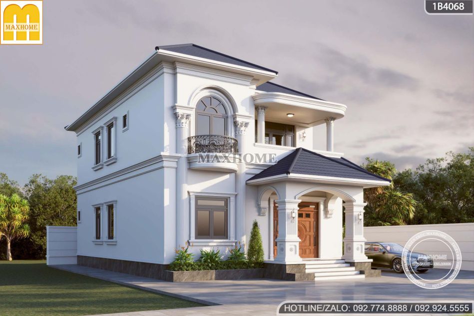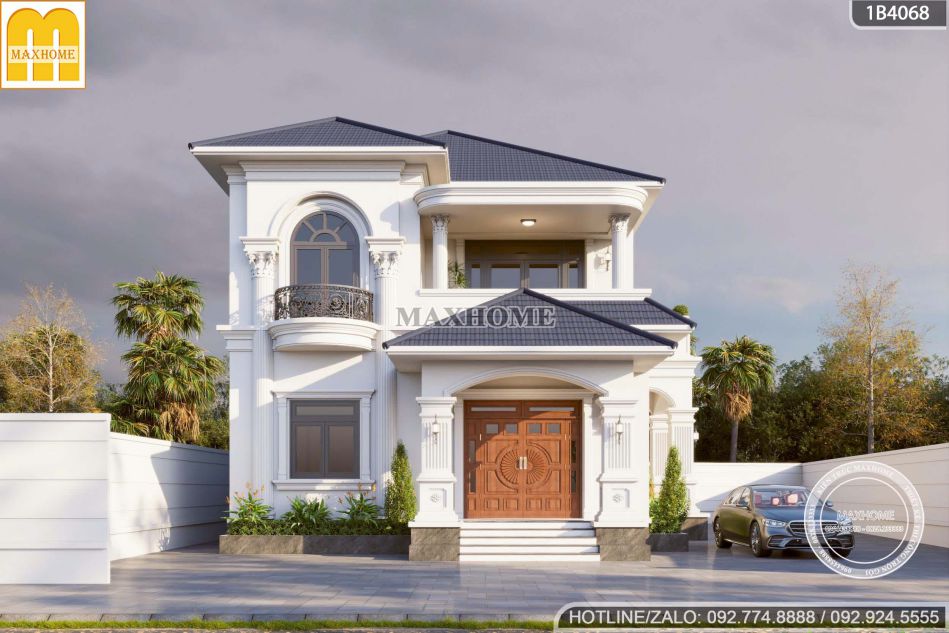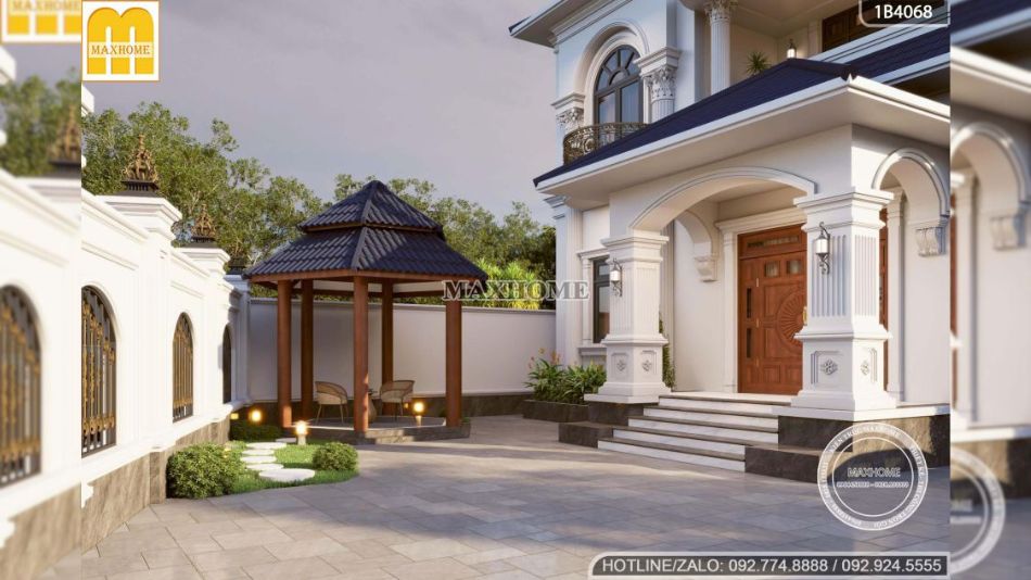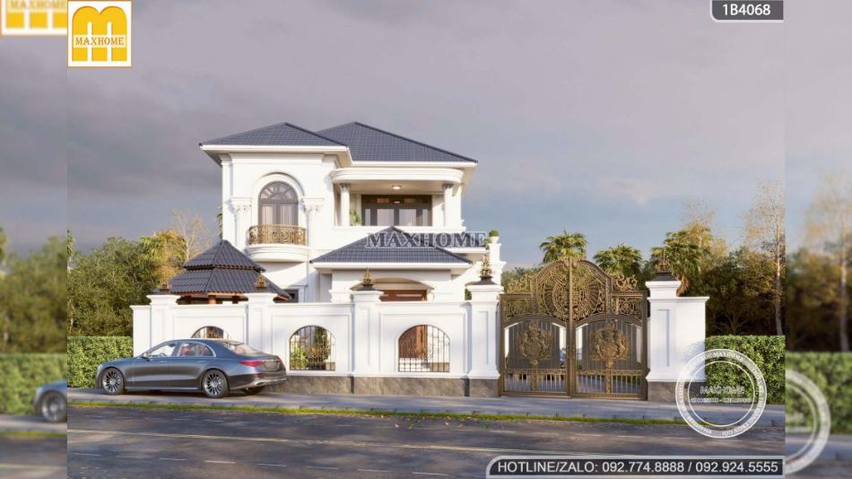 Mẫu biệt thự mái Nhật được thiết kế theo phong cách tân cổ điển, thể hiện rõ nét qua các hệ vòm mềm mại, đường phào chỉ tinh tế cùng những chi tiết đường cong bán nguyệt tại khu vực ban công tầng 2. Sự kết hợp hài hòa giữa các yếu tố kiến trúc này không chỉ tạo nên vẻ đẹp sang trọng, thanh lịch mà còn giúp tổng thể công trình trở nên cân đối, cuốn hút và giàu tính thẩm mỹ.